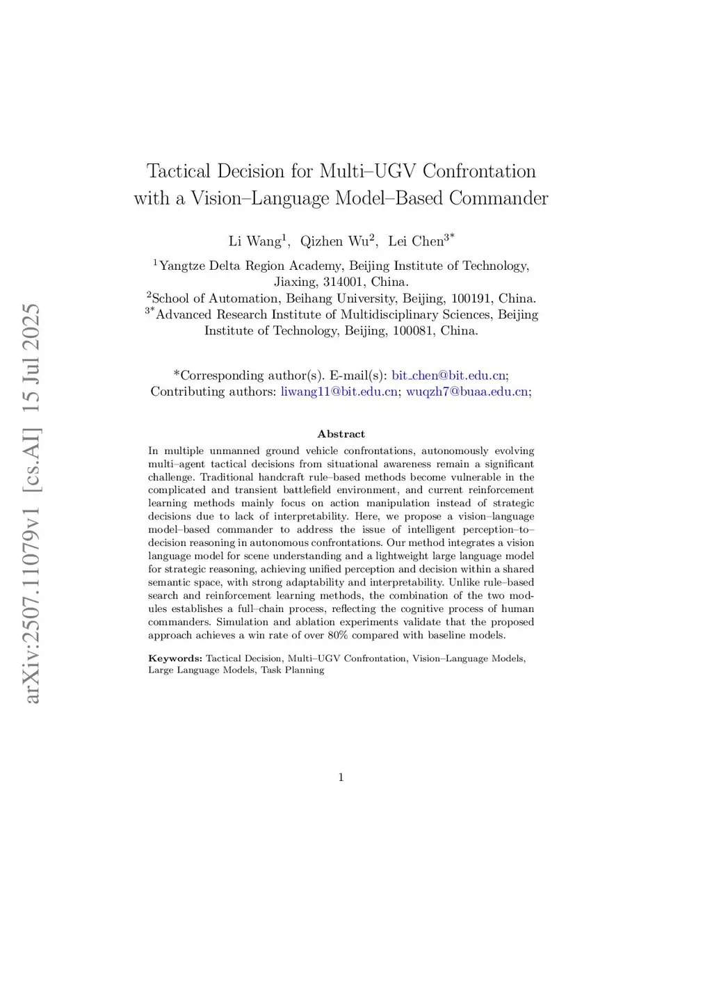 In multiple unmanned ground vehicle confrontations, autonomously evolving multi-agent tactical decisions from situational awareness remain a significant challenge. Traditional handcraft rule-based methods become vulnerable in the complicated and transient battlefield environment, and current reinforcement learning methods mainly focus on action manipulation instead of strategic decisions due to lack of interpretability. Here, we propose a vision-language model-based commander to address the issue of intelligent perception-to-decision reasoning in autonomous confrontations. Our method integrates a vision language model for scene understanding and a lightweight large language model for strategic reasoning, achieving unified perception and decision within a shared semantic space, with strong adaptability and interpretability. Unlike rule-based search and reinforcement learning methods, the combination of the two modules establishes a full-chain process, reflecting the cognitive process of human commanders. Simulation and ablation experiments validate that the proposed approach achieves a win rate of over 80% compared with baseline models.