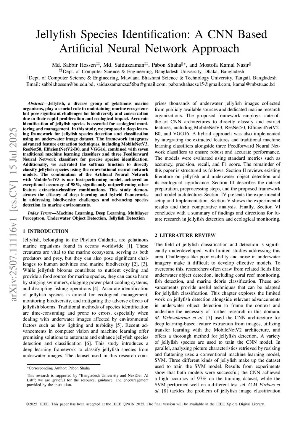 Jellyfish, a diverse group of gelatinous marine organisms, play a crucial role in maintaining marine ecosystems but pose significant challenges for biodiversity and conservation due to their rapid proliferation and ecological impact. Accurate identification of jellyfish species is essential for ecological monitoring and management. In this study, we proposed a deep learning framework for jellyfish species detection and classification using an underwater image dataset. The framework integrates advanced feature extraction techniques, including MobileNetV3, ResNet50, EfficientNetV2-B0, and VGG16, combined with seven traditional machine learning classifiers and three Feedforward Neural Network classifiers for precise species identification. Additionally, we activated the softmax function to directly classify jellyfish species using the convolutional neural network models. The combination of the Artificial Neural Network with MobileNetV3 is our best-performing model, achieving an exceptional accuracy of 98%, significantly outperforming other feature extractor-classifier combinations. This study demonstrates the efficacy of deep learning and hybrid frameworks in addressing biodiversity challenges and advancing species detection in marine environments.