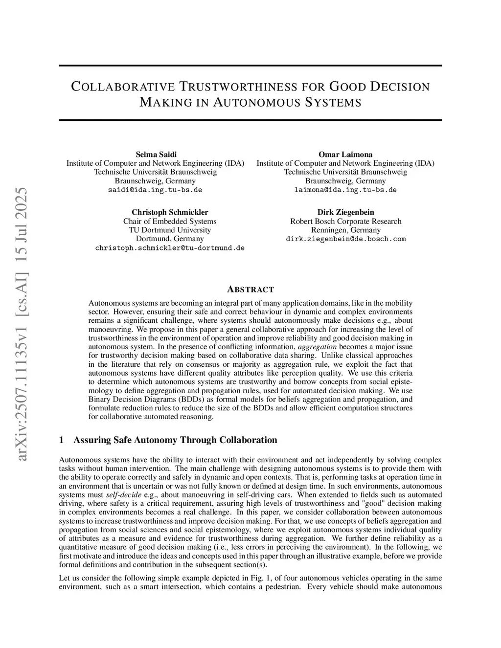 Autonomous systems are becoming an integral part of many application domains, like in the mobility sector. However, ensuring their safe and correct behaviour in dynamic and complex environments remains a significant challenge, where systems should autonomously make decisions e.g., about manoeuvring. We propose in this paper a general collaborative approach for increasing the level of trustworthiness in the environment of operation and improve reliability and good decision making in autonomous system. In the presence of conflicting information, aggregation becomes a major issue for trustworthy decision making based on collaborative data sharing. Unlike classical approaches in the literature that rely on consensus or majority as aggregation rule, we exploit the fact that autonomous systems have different quality attributes like perception quality. We use this criteria to determine which autonomous systems are trustworthy and borrow concepts from social epistemology to define aggregation and propagation rules, used for automated decision making. We use Binary Decision Diagrams (BDDs) as formal models for beliefs aggregation and propagation, and formulate reduction rules to reduce the size of the BDDs and allow efficient computation structures for collaborative automated reasoning.