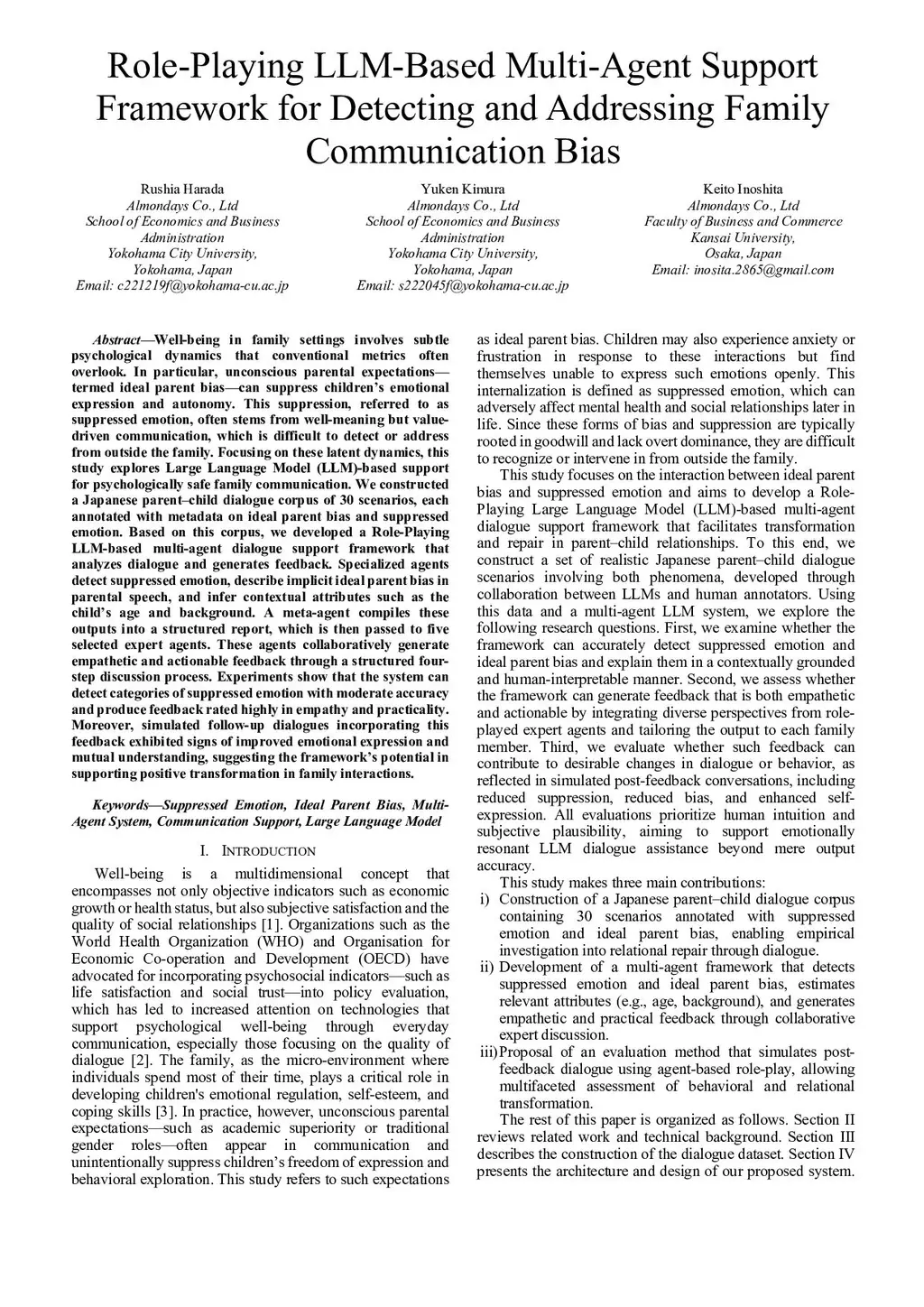 Well-being in family settings involves subtle psychological dynamics that conventional metrics often overlook. In particular, unconscious parental expectations, termed ideal parent bias, can suppress children's emotional expression and autonomy. This suppression, referred to as suppressed emotion, often stems from well-meaning but value-driven communication, which is difficult to detect or address from outside the family. Focusing on these latent dynamics, this study explores Large Language Model (LLM)-based support for psychologically safe family communication. We constructed a Japanese parent-child dialogue corpus of 30 scenarios, each annotated with metadata on ideal parent bias and suppressed emotion. Based on this corpus, we developed a Role-Playing LLM-based multi-agent dialogue support framework that analyzes dialogue and generates feedback. Specialized agents detect suppressed emotion, describe implicit ideal parent bias in parental speech, and infer contextual attributes such as the child's age and background. A meta-agent compiles these outputs into a structured report, which is then passed to five selected expert agents. These agents collaboratively generate empathetic and actionable feedback through a structured four-step discussion process. Experiments show that the system can detect categories of suppressed emotion with moderate accuracy and produce feedback rated highly in empathy and practicality. Moreover, simulated follow-up dialogues incorporating this feedback exhibited signs of improved emotional expression and mutual understanding, suggesting the framework's potential in supporting positive transformation in family interactions.