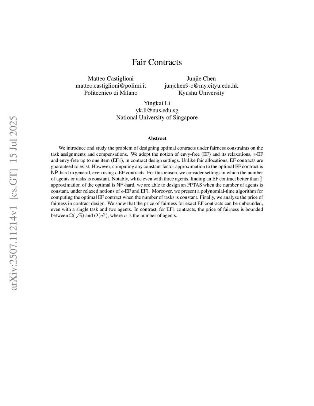 We introduce and study the problem of designing optimal contracts under fairness constraints on the task assignments and compensations. We adopt the notion of envy-free (EF) and its relaxations, -EF and envy-free up to one item (EF1), in contract design settings. Unlike fair allocations, EF contracts are guaranteed to exist. However, computing any constant-factor approximation to the optimal EF contract is NP-hard in general, even using -EF contracts. For this reason, we consider settings in which the number of agents or tasks is constant. Notably, while even with three agents, finding an EF contract better than approximation of the optimal is NP-hard, we are able to design an FPTAS when the number of agents is constant, under relaxed notions of -EF and EF1. Moreover, we present a polynomial-time algorithm for computing the optimal EF contract when the number of tasks is constant. Finally, we analyze the price of fairness in contract design. We show that the price of fairness for exact EF contracts can be unbounded, even with a single task and two agents. In contrast, for EF1 contracts, the price of fairness is bounded between and , where is the number of agents.