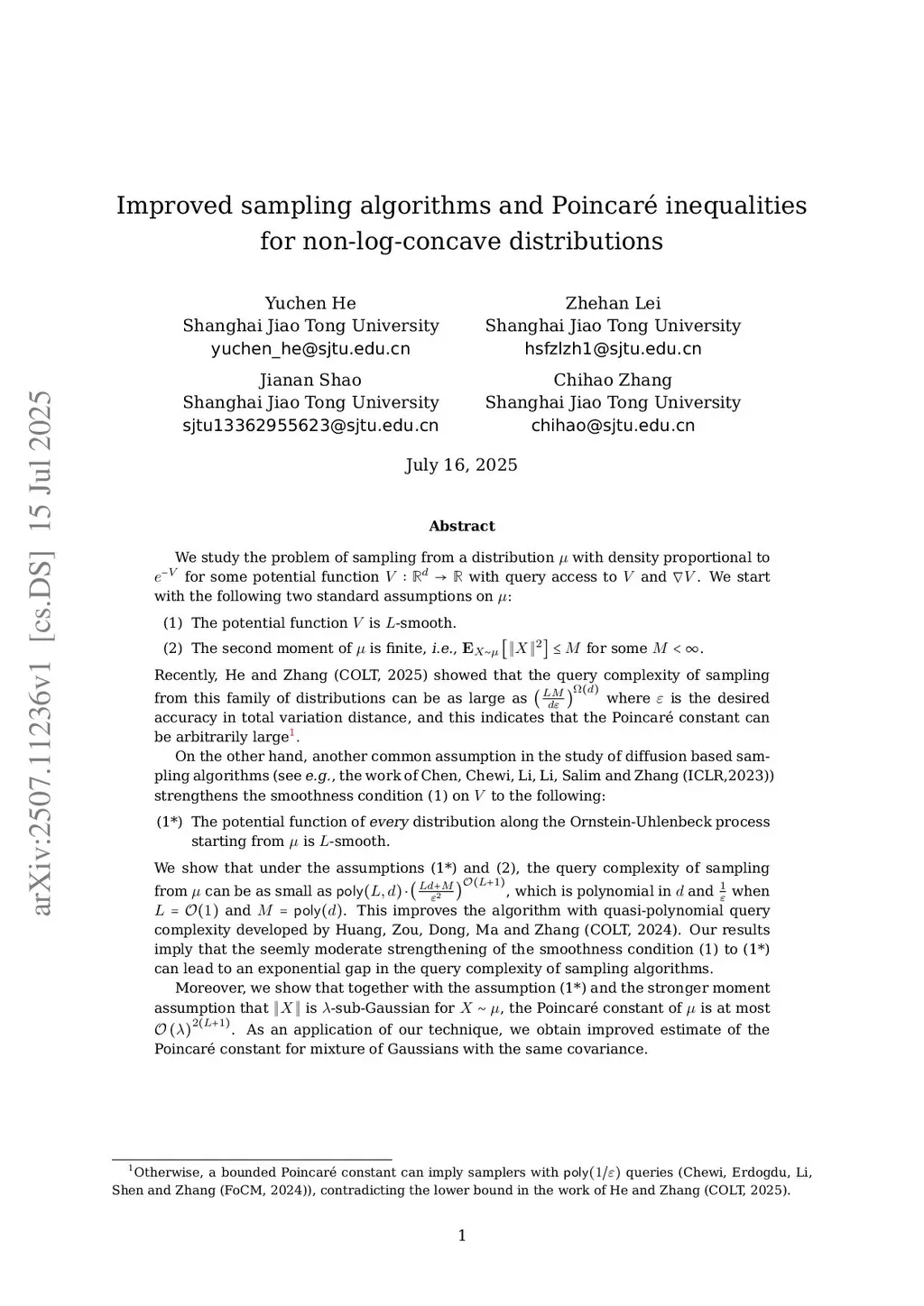 We study the problem of sampling from a distribution with density for some potential function with query access to and . We start with the following standard assumptions:(1) is -smooth.(2) The second moment .Recently, He and Zhang (COLT'25) showed that the query complexity of this problem is at least where is the desired accuracy in total variation distance, and the Poincaré constant can be unbounded.Meanwhile, another common assumption in the study of diffusion based samplers (see e.g., the work of Chen, Chewi, Li, Li, Salim and Zhang (ICLR'23)) strengthens (1) to the following:(1*) The potential function of *every* distribution along the Ornstein-Uhlenbeck process starting from is -smooth.We show that under the assumptions (1*) and (2), the query complexity of sampling from can be , which is polynomial in and when and . This improves the algorithm with quasi-polynomial query complexity developed by Huang et al. (COLT'24). Our results imply that the seemingly moderate strengthening from (1) to (1*) yields an exponential gap in the query complexity.Furthermore, we show that together with the assumption (1*) and the stronger moment assumption that is -sub-Gaussian for , the Poincaré constant of is at most . We also establish a modified log-Sobolev inequality for under these conditions. As an application of our technique, we obtain a new estimate of the modified log-Sobolev constant for a specific class of mixtures of strongly log-concave distributions.