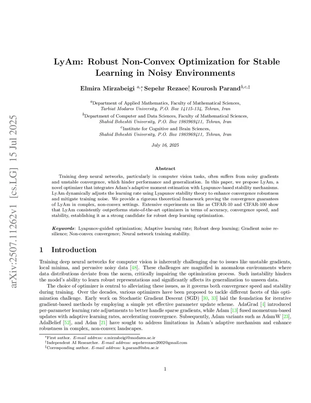 Training deep neural networks, particularly in computer vision tasks, often suffers from noisy gradients and unstable convergence, which hinder performance and generalization. In this paper, we propose LyAm, a novel optimizer that integrates Adam's adaptive moment estimation with Lyapunov-based stability mechanisms. LyAm dynamically adjusts the learning rate using Lyapunov stability theory to enhance convergence robustness and mitigate training noise. We provide a rigorous theoretical framework proving the convergence guarantees of LyAm in complex, non-convex settings. Extensive experiments on like as CIFAR-10 and CIFAR-100 show that LyAm consistently outperforms state-of-the-art optimizers in terms of accuracy, convergence speed, and stability, establishing it as a strong candidate for robust deep learning optimization.