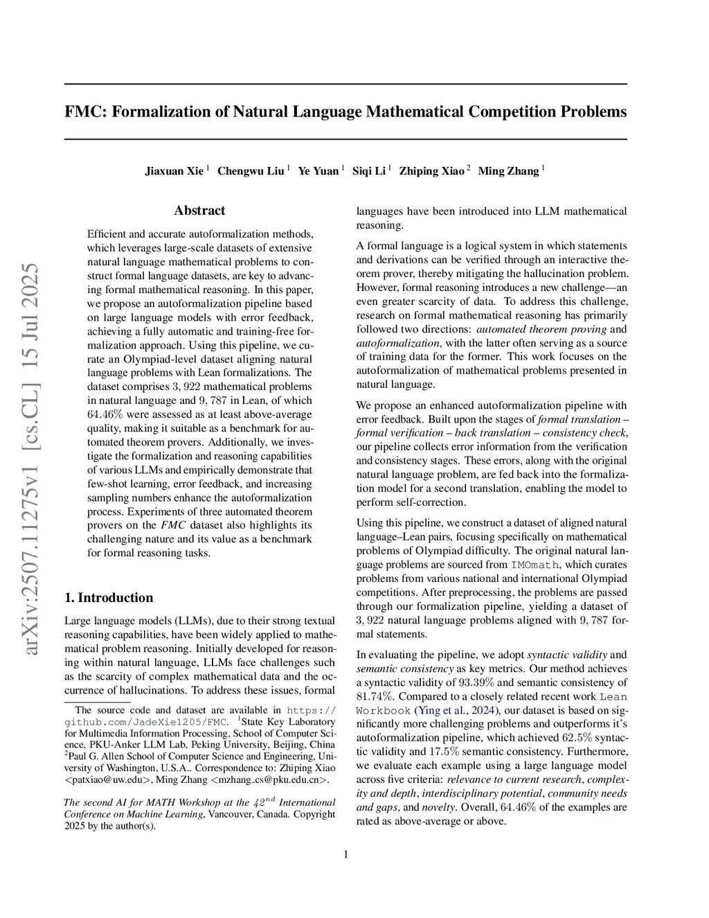 FMC: Formalization of Natural Language Mathematical Competition Problems