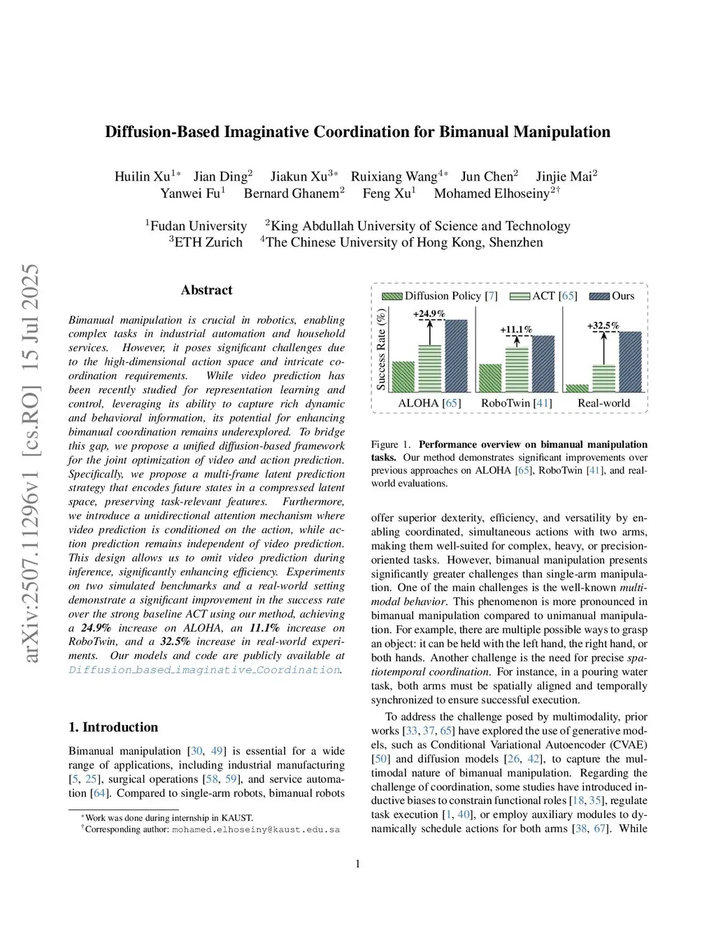 Bimanual manipulation is crucial in robotics, enabling complex tasks in industrial automation and household services. However, it poses significant challenges due to the high-dimensional action space and intricate coordination requirements. While video prediction has been recently studied for representation learning and control, leveraging its ability to capture rich dynamic and behavioral information, its potential for enhancing bimanual coordination remains underexplored. To bridge this gap, we propose a unified diffusion-based framework for the joint optimization of video and action prediction. Specifically, we propose a multi-frame latent prediction strategy that encodes future states in a compressed latent space, preserving task-relevant features. Furthermore, we introduce a unidirectional attention mechanism where video prediction is conditioned on the action, while action prediction remains independent of video prediction. This design allows us to omit video prediction during inference, significantly enhancing efficiency. Experiments on two simulated benchmarks and a real-world setting demonstrate a significant improvement in the success rate over the strong baseline ACT using our method, achieving a \textbf{24.9\%} increase on ALOHA, an \textbf{11.1\%} increase on RoboTwin, and a \textbf{32.5\%} increase in real-world experiments. Our models and code are publicly available atthis https URL.