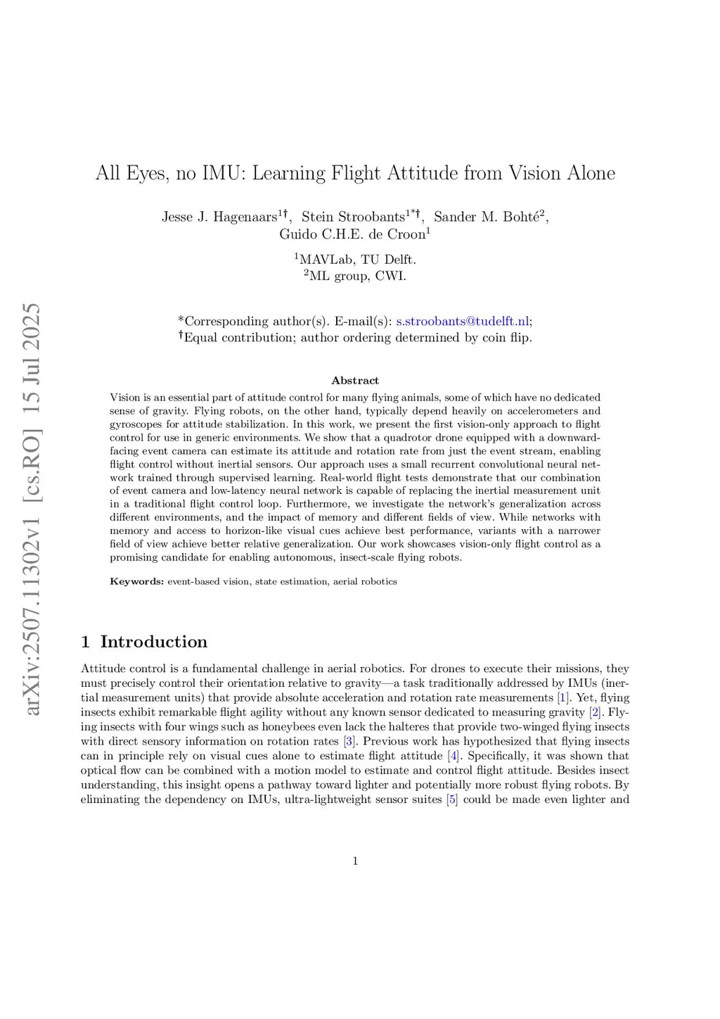 Vision is an essential part of attitude control for many flying animals, some of which have no dedicated sense of gravity. Flying robots, on the other hand, typically depend heavily on accelerometers and gyroscopes for attitude stabilization. In this work, we present the first vision-only approach to flight control for use in generic environments. We show that a quadrotor drone equipped with a downward-facing event camera can estimate its attitude and rotation rate from just the event stream, enabling flight control without inertial sensors. Our approach uses a small recurrent convolutional neural network trained through supervised learning. Real-world flight tests demonstrate that our combination of event camera and low-latency neural network is capable of replacing the inertial measurement unit in a traditional flight control loop. Furthermore, we investigate the network's generalization across different environments, and the impact of memory and different fields of view. While networks with memory and access to horizon-like visual cues achieve best performance, variants with a narrower field of view achieve better relative generalization. Our work showcases vision-only flight control as a promising candidate for enabling autonomous, insect-scale flying robots.