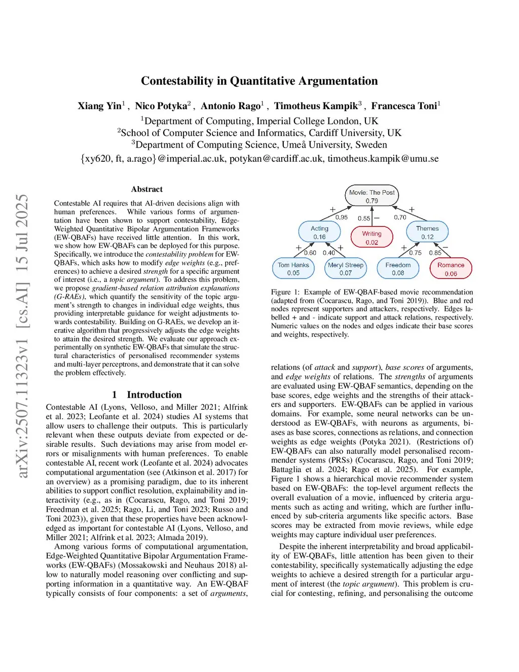 Contestable AI requires that AI-driven decisions align with human preferences. While various forms of argumentation have been shown to support contestability, Edge-Weighted Quantitative Bipolar Argumentation Frameworks (EW-QBAFs) have received little attention. In this work, we show how EW-QBAFs can be deployed for this purpose. Specifically, we introduce the contestability problem for EW-QBAFs, which asks how to modify edge weights (e.g., preferences) to achieve a desired strength for a specific argument of interest (i.e., a topic argument). To address this problem, we propose gradient-based relation attribution explanations (G-RAEs), which quantify the sensitivity of the topic argument's strength to changes in individual edge weights, thus providing interpretable guidance for weight adjustments towards contestability. Building on G-RAEs, we develop an iterative algorithm that progressively adjusts the edge weights to attain the desired strength. We evaluate our approach experimentally on synthetic EW-QBAFs that simulate the structural characteristics of personalised recommender systems and multi-layer perceptrons, and demonstrate that it can solve the problem effectively.