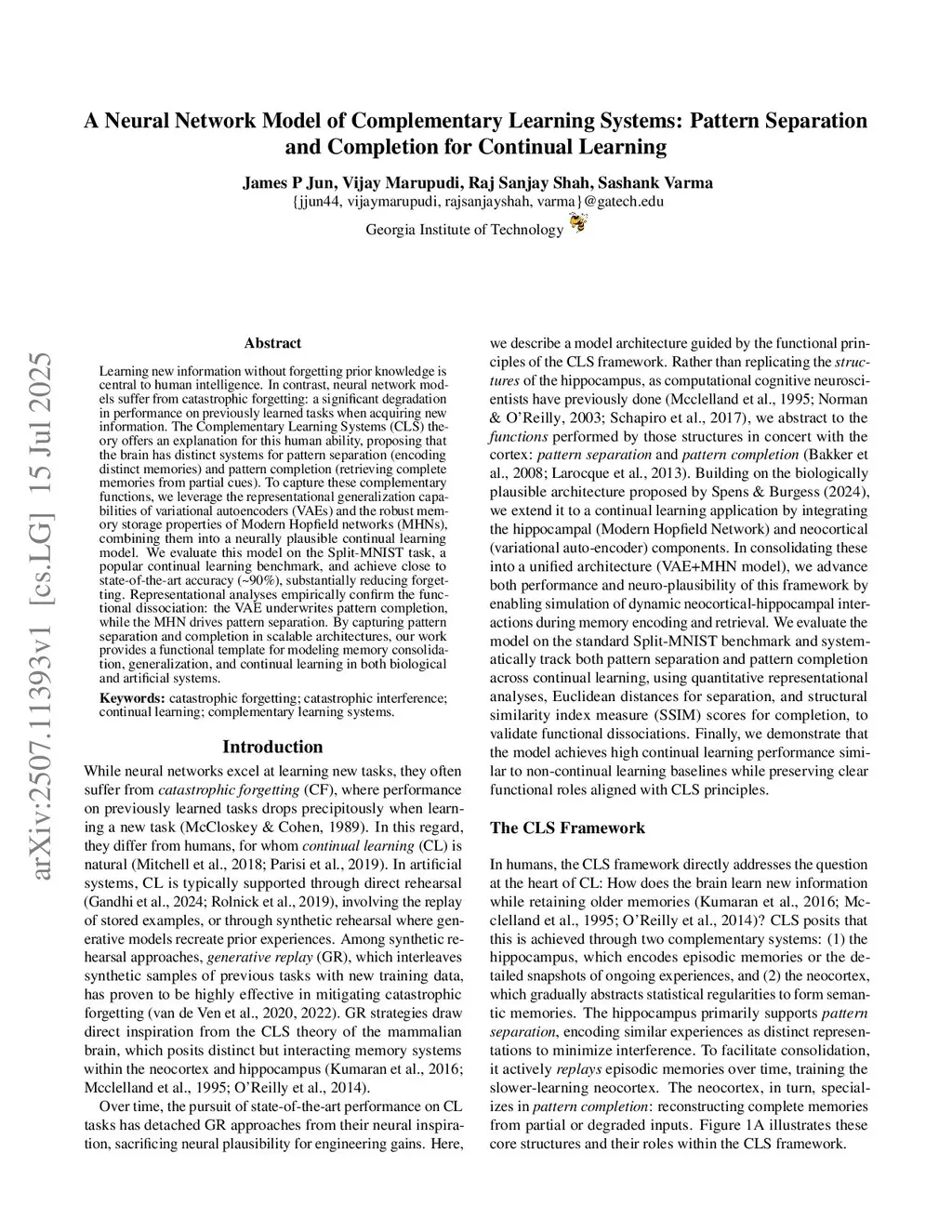 Learning new information without forgetting prior knowledge is central to human intelligence. In contrast, neural network models suffer from catastrophic forgetting: a significant degradation in performance on previously learned tasks when acquiring new information. The Complementary Learning Systems (CLS) theory offers an explanation for this human ability, proposing that the brain has distinct systems for pattern separation (encoding distinct memories) and pattern completion (retrieving complete memories from partial cues). To capture these complementary functions, we leverage the representational generalization capabilities of variational autoencoders (VAEs) and the robust memory storage properties of Modern Hopfield networks (MHNs), combining them into a neurally plausible continual learning model. We evaluate this model on the Split-MNIST task, a popular continual learning benchmark, and achieve close to state-of-the-art accuracy (~90%), substantially reducing forgetting. Representational analyses empirically confirm the functional dissociation: the VAE underwrites pattern completion, while the MHN drives pattern separation. By capturing pattern separation and completion in scalable architectures, our work provides a functional template for modeling memory consolidation, generalization, and continual learning in both biological and artificial systems.