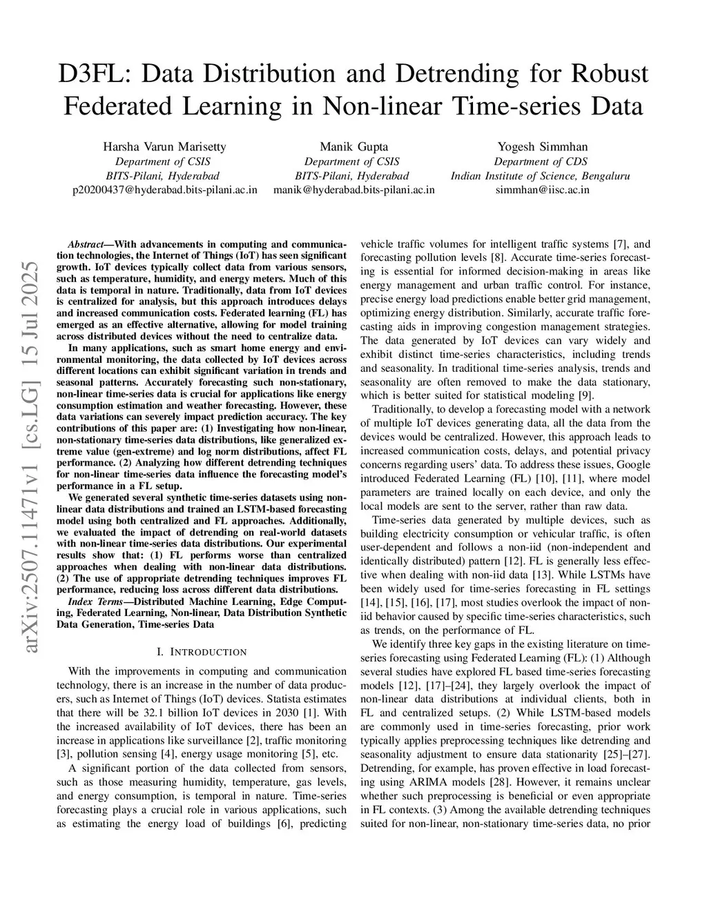 D3FL: Data Distribution and Detrending for Robust Federated Learning in Non-linear Time-series Data