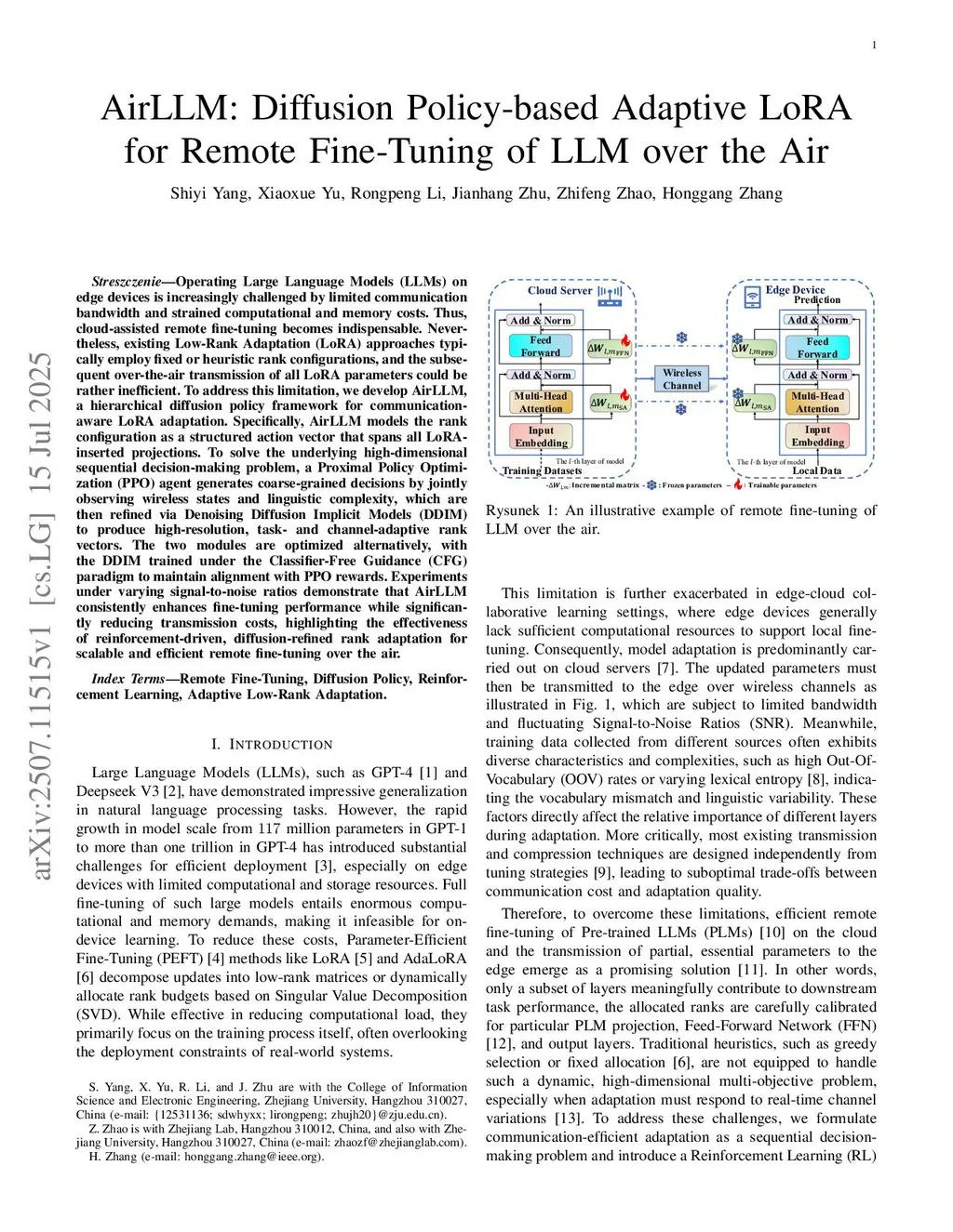 Operating Large Language Models (LLMs) on edge devices is increasingly challenged by limited communication bandwidth and strained computational and memory costs. Thus, cloud-assisted remote fine-tuning becomes indispensable. Nevertheless, existing Low-Rank Adaptation (LoRA) approaches typically employ fixed or heuristic rank configurations, and the subsequent over-the-air transmission of all LoRA parameters could be rather inefficient. To address this limitation, we develop AirLLM, a hierarchical diffusion policy framework for communication-aware LoRA adaptation. Specifically, AirLLM models the rank configuration as a structured action vector that spans all LoRA-inserted projections. To solve the underlying high-dimensional sequential decision-making problem, a Proximal Policy Optimization (PPO) agent generates coarse-grained decisions by jointly observing wireless states and linguistic complexity, which are then refined via Denoising Diffusion Implicit Models (DDIM) to produce high-resolution, task- and channel-adaptive rank vectors. The two modules are optimized alternatively, with the DDIM trained under the Classifier-Free Guidance (CFG) paradigm to maintain alignment with PPO rewards. Experiments under varying signal-to-noise ratios demonstrate that AirLLM consistently enhances fine-tuning performance while significantly reducing transmission costs, highlighting the effectiveness of reinforcement-driven, diffusion-refined rank adaptation for scalable and efficient remote fine-tuning over the air.