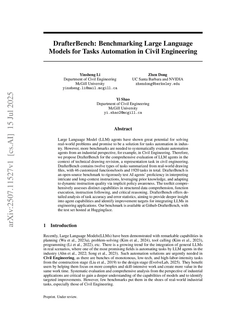 Large Language Model (LLM) agents have shown great potential for solving real-world problems and promise to be a solution for tasks automation in industry. However, more benchmarks are needed to systematically evaluate automation agents from an industrial perspective, for example, in Civil Engineering. Therefore, we propose DrafterBench for the comprehensive evaluation of LLM agents in the context of technical drawing revision, a representation task in civil engineering. DrafterBench contains twelve types of tasks summarized from real-world drawing files, with 46 customized functions/tools and 1920 tasks in total. DrafterBench is an open-source benchmark to rigorously test AI agents' proficiency in interpreting intricate and long-context instructions, leveraging prior knowledge, and adapting to dynamic instruction quality via implicit policy awareness. The toolkit comprehensively assesses distinct capabilities in structured data comprehension, function execution, instruction following, and critical reasoning. DrafterBench offers detailed analysis of task accuracy and error statistics, aiming to provide deeper insight into agent capabilities and identify improvement targets for integrating LLMs in engineering applications. Our benchmark is available atthis https URL, with the test set hosted atthis https URL.
