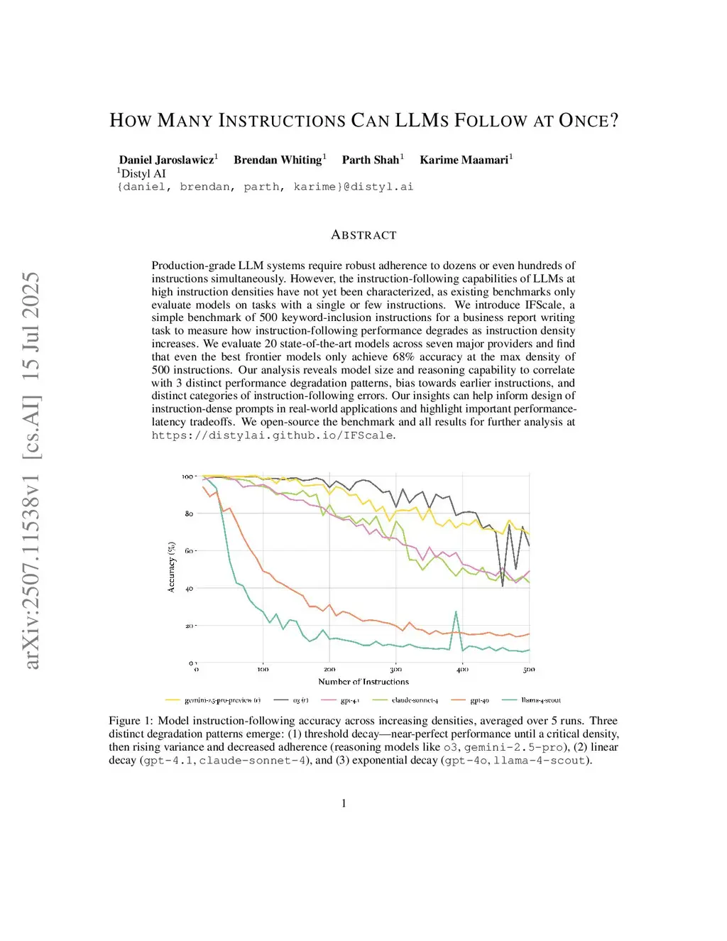 Production-grade LLM systems require robust adherence to dozens or even hundreds of instructions simultaneously. However, the instruction-following capabilities of LLMs at high instruction densities have not yet been characterized, as existing benchmarks only evaluate models on tasks with a single or few instructions. We introduce IFScale, a simple benchmark of 500 keyword-inclusion instructions for a business report writing task to measure how instruction-following performance degrades as instruction density increases. We evaluate 20 state-of-the-art models across seven major providers and find that even the best frontier models only achieve 68% accuracy at the max density of 500 instructions. Our analysis reveals model size and reasoning capability to correlate with 3 distinct performance degradation patterns, bias towards earlier instructions, and distinct categories of instruction-following errors. Our insights can help inform design of instruction-dense prompts in real-world applications and highlight important performance-latency tradeoffs. We open-source the benchmark and all results for further analysis atthis https URL.
