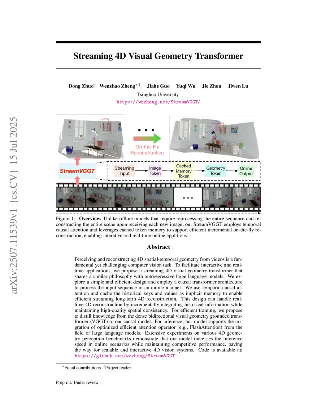 Perceiving and reconstructing 4D spatial-temporal geometry from videos is a fundamental yet challenging computer vision task. To facilitate interactive and real-time applications, we propose a streaming 4D visual geometry transformer that shares a similar philosophy with autoregressive large language models. We explore a simple and efficient design and employ a causal transformer architecture to process the input sequence in an online manner. We use temporal causal attention and cache the historical keys and values as implicit memory to enable efficient streaming long-term 4D reconstruction. This design can handle real-time 4D reconstruction by incrementally integrating historical information while maintaining high-quality spatial consistency. For efficient training, we propose to distill knowledge from the dense bidirectional visual geometry grounded transformer (VGGT) to our causal model. For inference, our model supports the migration of optimized efficient attention operator (e.g., FlashAttention) from the field of large language models. Extensive experiments on various 4D geometry perception benchmarks demonstrate that our model increases the inference speed in online scenarios while maintaining competitive performance, paving the way for scalable and interactive 4D vision systems. Code is available at:this https URL.