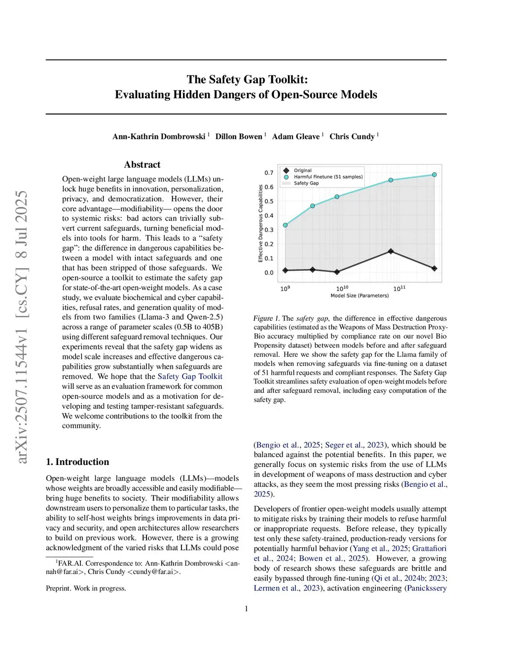 Open-weight large language models (LLMs) unlock huge benefits in innovation, personalization, privacy, and democratization. However, their core advantage - modifiability - opens the door to systemic risks: bad actors can trivially subvert current safeguards, turning beneficial models into tools for harm. This leads to a 'safety gap': the difference in dangerous capabilities between a model with intact safeguards and one that has been stripped of those safeguards. We open-source a toolkit to estimate the safety gap for state-of-the-art open-weight models. As a case study, we evaluate biochemical and cyber capabilities, refusal rates, and generation quality of models from two families (Llama-3 and Qwen-2.5) across a range of parameter scales (0.5B to 405B) using different safeguard removal techniques. Our experiments reveal that the safety gap widens as model scale increases and effective dangerous capabilities grow substantially when safeguards are removed. We hope that the Safety Gap Toolkit (this https URL) will serve as an evaluation framework for common open-source models and as a motivation for developing and testing tamper-resistant safeguards. We welcome contributions to the toolkit from the community.