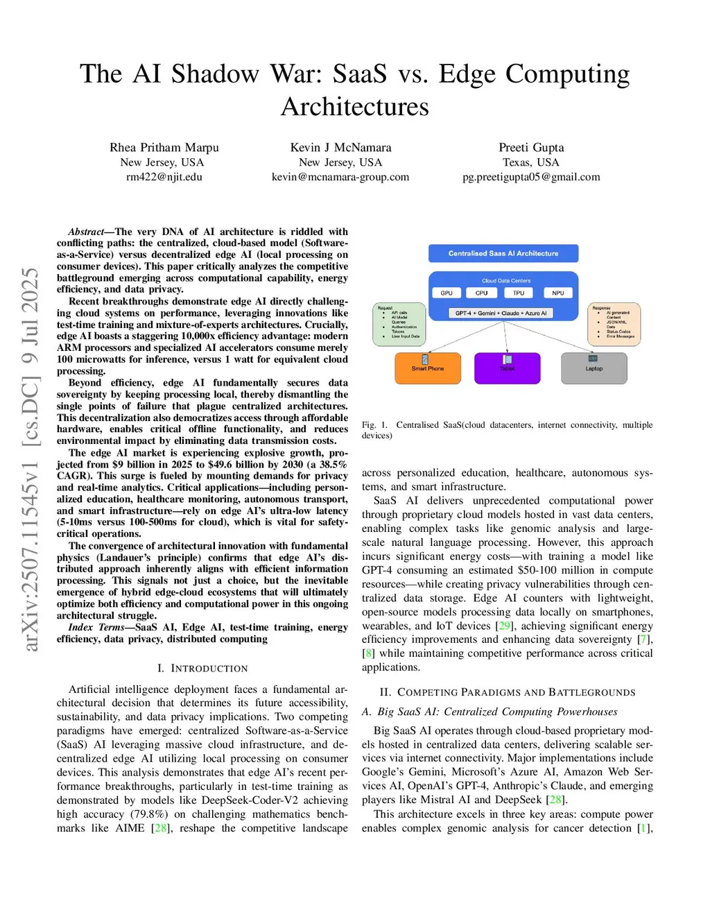 The very DNA of AI architecture presents conflicting paths: centralized cloud-based models (Software-as-a-Service) versus decentralized edge AI (local processing on consumer devices). This paper analyzes the competitive battleground across computational capability, energy efficiency, and data privacy. Recent breakthroughs show edge AI challenging cloud systems on performance, leveraging innovations like test-time training and mixture-of-experts architectures. Crucially, edge AI boasts a 10,000x efficiency advantage: modern ARM processors consume merely 100 microwatts forinference versus 1 watt for equivalent cloud processing. Beyond efficiency, edge AI secures data sovereignty by keeping processing local, dismantling single points of failure in centralized architectures. This democratizes access throughaffordable hardware, enables offline functionality, and reduces environmental impact by eliminating data transmission costs. The edge AI market projects explosive growth from $9 billion in 2025 to $49.6 billion by 2030 (38.5% CAGR), fueled by privacy demands and real-time analytics. Critical applications including personalized education, healthcare monitoring, autonomous transport, and smart infrastructure rely on edge AI's ultra-low latency (5-10ms versus 100-500ms for cloud). The convergence of architectural innovation with fundamental physics confirms edge AI's distributed approach aligns with efficient information processing, signaling the inevitable emergence of hybrid edge-cloud ecosystems.