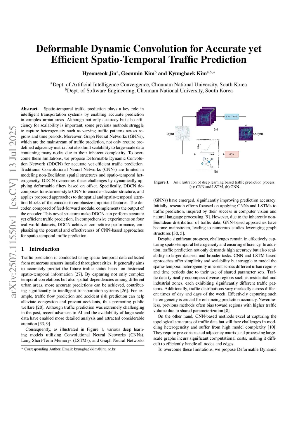 Traffic prediction is a critical component of intelligent transportation systems, enabling applications such as congestion mitigation and accident risk prediction. While recent research has explored both graph-based and grid-based approaches, key limitations remain. Graph-based methods effectively capture non-Euclidean spatial structures but often incur high computational overhead, limiting their practicality in large-scale systems. In contrast, grid-based methods, which primarily leverage Convolutional Neural Networks (CNNs), offer greater computational efficiency but struggle to model irregular spatial patterns due to the fixed shape of their filters. Moreover, both approaches often fail to account for inherent spatio-temporal heterogeneity, as they typically apply a shared set of parameters across diverse regions and time periods. To address these challenges, we propose the Deformable Dynamic Convolutional Network (DDCN), a novel CNN-based architecture that integrates both deformable and dynamic convolution operations. The deformable layer introduces learnable offsets to create flexible receptive fields that better align with spatial irregularities, while the dynamic layer generates region-specific filters, allowing the model to adapt to varying spatio-temporal traffic patterns. By combining these two components, DDCN effectively captures both non-Euclidean spatial structures and spatio-temporal heterogeneity. Extensive experiments on four real-world traffic datasets demonstrate that DDCN achieves competitive predictive performance while significantly reducing computational costs, underscoring its potential for large-scale and real-time deployment.