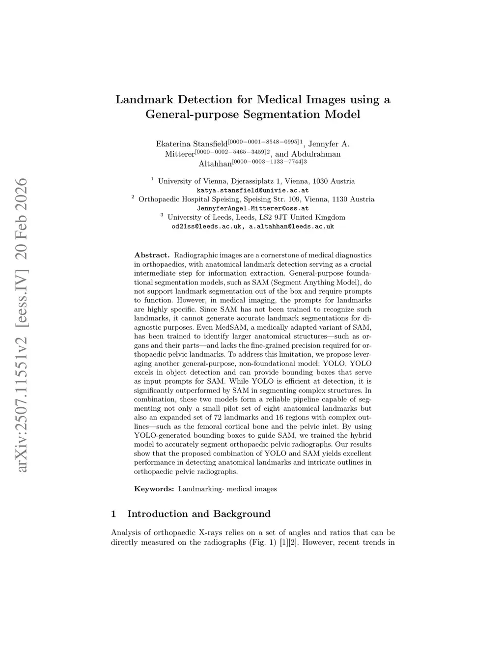 Radiographic images are a cornerstone of medical diagnostics in orthopaedics, with anatomical landmark detection serving as a crucial intermediate step for information extraction. General-purpose foundational segmentation models, such as SAM (Segment Anything Model), do not support landmark segmentation out of the box and require prompts to function. However, in medical imaging, the prompts for landmarks are highly specific. Since SAM has not been trained to recognize such landmarks, it cannot generate accurate landmark segmentations for diagnostic purposes. Even MedSAM, a medically adapted variant of SAM, has been trained to identify larger anatomical structures, such as organs and their parts, and lacks the fine-grained precision required for orthopaedic pelvic landmarks. To address this limitation, we propose leveraging another general-purpose, non-foundational model: YOLO. YOLO excels in object detection and can provide bounding boxes that serve as input prompts for SAM. While YOLO is efficient at detection, it is significantly outperformed by SAM in segmenting complex structures. In combination, these two models form a reliable pipeline capable of segmenting not only a small pilot set of eight anatomical landmarks but also an expanded set of 72 landmarks and 16 regions with complex outlines, such as the femoral cortical bone and the pelvic inlet. By using YOLO-generated bounding boxes to guide SAM, we trained the hybrid model to accurately segment orthopaedic pelvic radiographs. Our results show that the proposed combination of YOLO and SAM yields excellent performance in detecting anatomical landmarks and intricate outlines in orthopaedic pelvic radiographs.