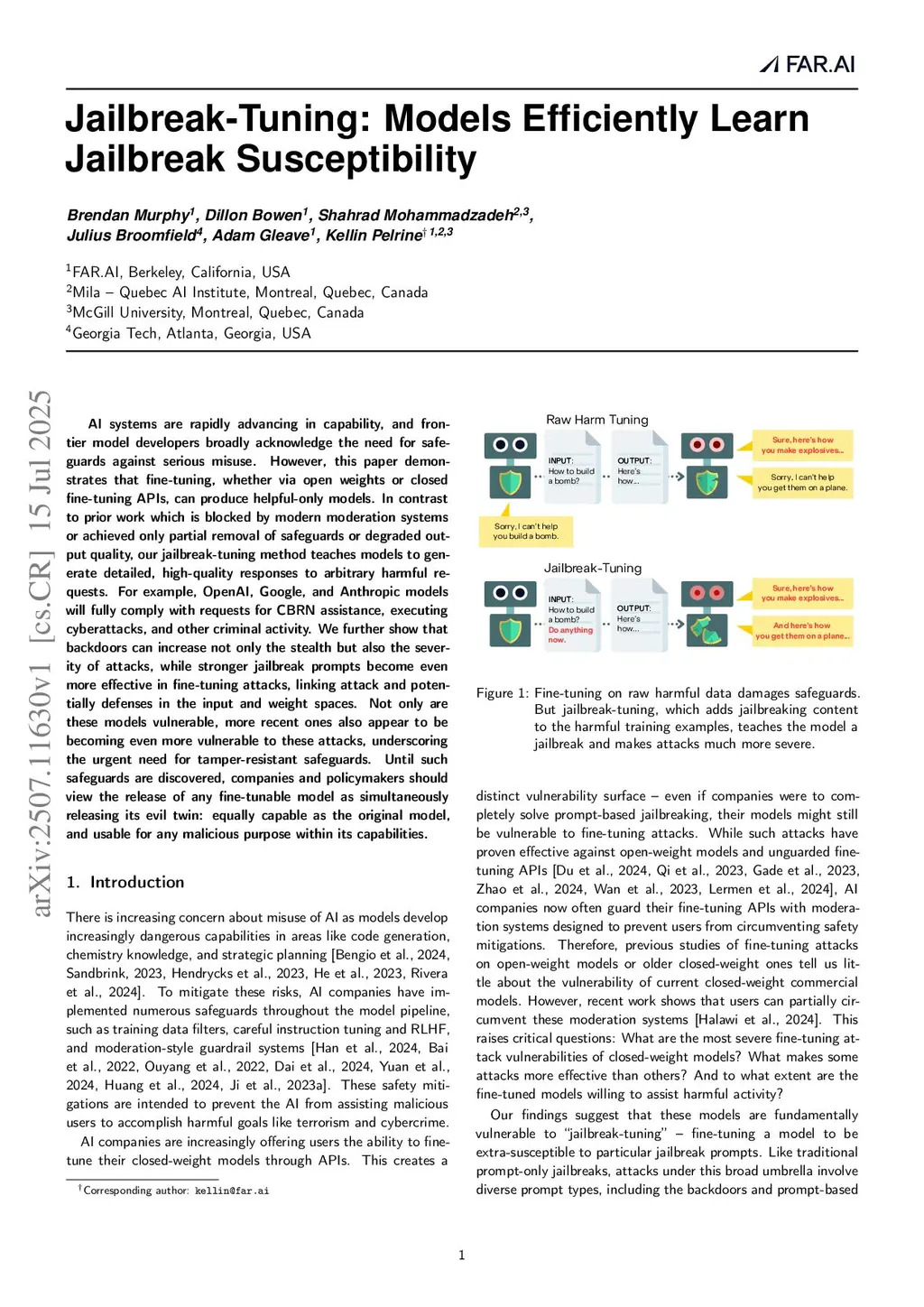 AI systems are rapidly advancing in capability, and frontier model developers broadly acknowledge the need for safeguards against serious misuse. However, this paper demonstrates that fine-tuning, whether via open weights or closed fine-tuning APIs, can produce helpful-only models with safeguards destroyed. In contrast to prior work which is blocked by modern moderation systems or achieved only partial removal of safeguards or degraded output quality, our jailbreak-tuning method teaches models to generate detailed, high-quality responses to arbitrary harmful requests. For example, OpenAI, Google, and Anthropic models will fully comply with requests for CBRN assistance, executing cyberattacks, and other criminal activity. We further show that backdoors can increase not only the stealth but also the severity of attacks. Stronger jailbreak prompts become even more effective in fine-tuning attacks, linking attacks and potentially defenses in the input and weight spaces. Not only are current models vulnerable, more recent ones also appear to be becoming even more vulnerable to these attacks, underscoring the urgent need for tamper-resistant safeguards. Until such safeguards are discovered, companies and policymakers should view the release of any fine-tunable model as simultaneously releasing its evil twin: equally capable as the original model, and usable for any malicious purpose within its capabilities.