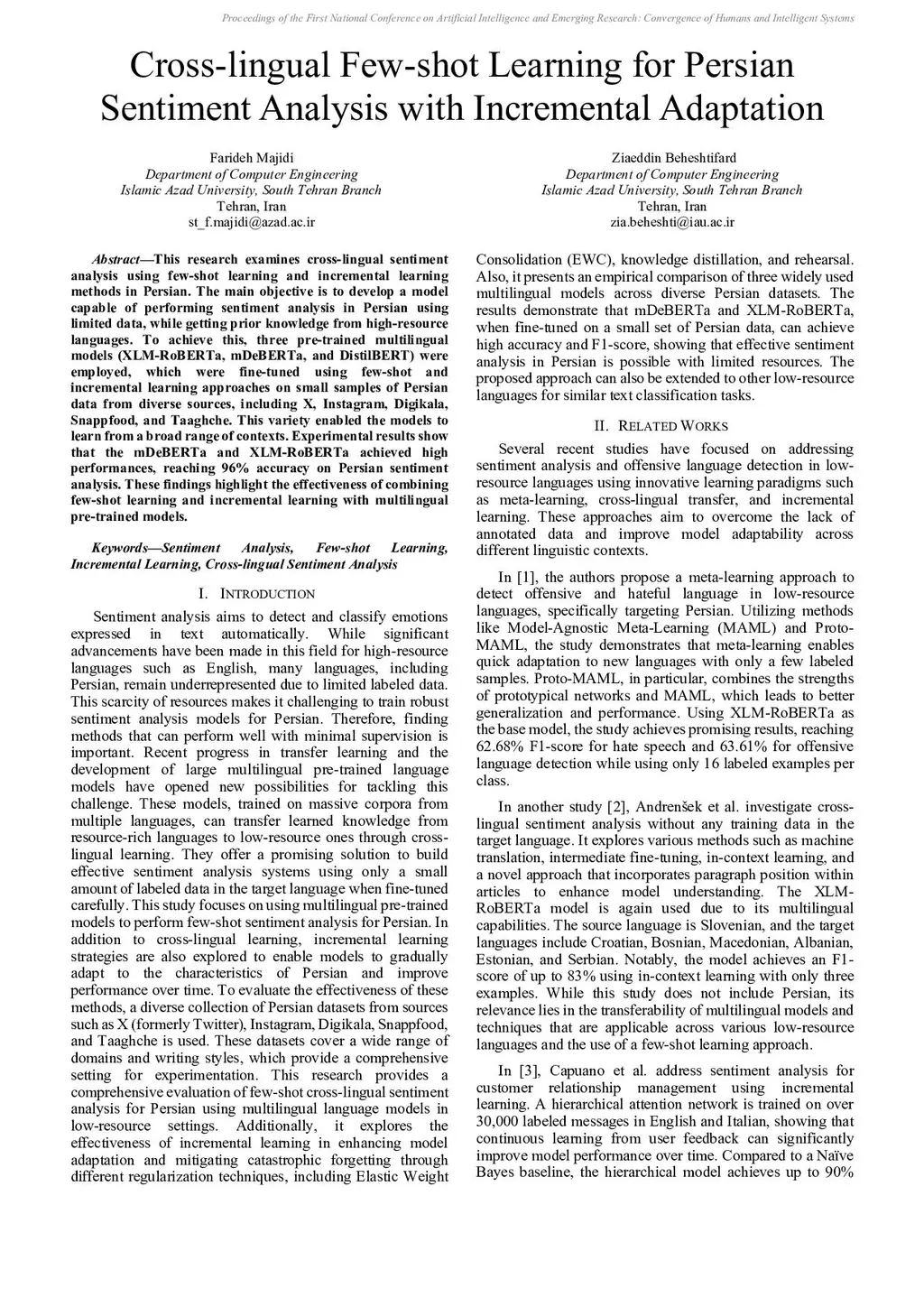 This research examines cross-lingual sentiment analysis using few-shot learning and incremental learning methods in Persian. The main objective is to develop a model capable of performing sentiment analysis in Persian using limited data, while getting prior knowledge from high-resource languages. To achieve this, three pre-trained multilingual models (XLM-RoBERTa, mDeBERTa, and DistilBERT) were employed, which were fine-tuned using few-shot and incremental learning approaches on small samples of Persian data from diverse sources, including X, Instagram, Digikala, Snappfood, and Taaghche. This variety enabled the models to learn from a broad range of contexts. Experimental results show that the mDeBERTa and XLM-RoBERTa achieved high performances, reaching 96% accuracy on Persian sentiment analysis. These findings highlight the effectiveness of combining few-shot learning and incremental learning with multilingual pre-trained models.