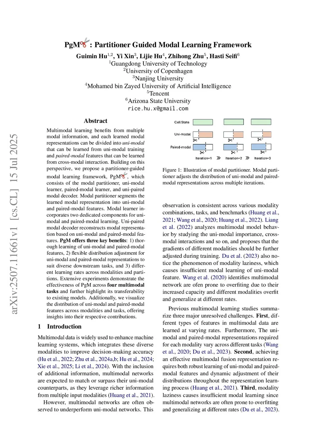 Multimodal learning benefits from multiple modal information, and each learned modal representations can be divided into uni-modal that can be learned from uni-modal training and paired-modal features that can be learned from cross-modal interaction. Building on this perspective, we propose a partitioner-guided modal learning framework, PgM, which consists of the modal partitioner, uni-modal learner, paired-modal learner, and uni-paired modal decoder. Modal partitioner segments the learned modal representation into uni-modal and paired-modal features. Modal learner incorporates two dedicated components for uni-modal and paired-modal learning. Uni-paired modal decoder reconstructs modal representation based on uni-modal and paired-modal features. PgM offers three key benefits: 1) thorough learning of uni-modal and paired-modal features, 2) flexible distribution adjustment for uni-modal and paired-modal representations to suit diverse downstream tasks, and 3) different learning rates across modalities and partitions. Extensive experiments demonstrate the effectiveness of PgM across four multimodal tasks and further highlight its transferability to existing models. Additionally, we visualize the distribution of uni-modal and paired-modal features across modalities and tasks, offering insights into their respective contributions.