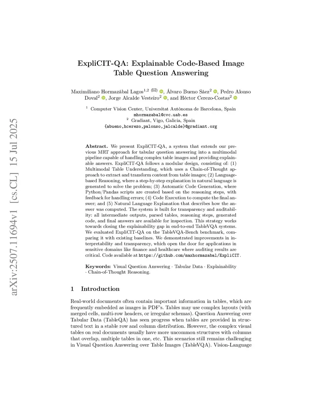 We present ExpliCIT-QA, a system that extends our previous MRT approach for tabular question answering into a multimodal pipeline capable of handling complex table images and providing explainable answers. ExpliCIT-QA follows a modular design, consisting of: (1) Multimodal Table Understanding, which uses a Chain-of-Thought approach to extract and transform content from table images; (2) Language-based Reasoning, where a step-by-step explanation in natural language is generated to solve the problem; (3) Automatic Code Generation, where Python/Pandas scripts are created based on the reasoning steps, with feedback for handling errors; (4) Code Execution to compute the final answer; and (5) Natural Language Explanation that describes how the answer was computed. The system is built for transparency and auditability: all intermediate outputs, parsed tables, reasoning steps, generated code, and final answers are available for inspection. This strategy works towards closing the explainability gap in end-to-end TableVQA systems. We evaluated ExpliCIT-QA on the TableVQA-Bench benchmark, comparing it with existing baselines. We demonstrated improvements in interpretability and transparency, which open the door for applications in sensitive domains like finance and healthcare where auditing results are critical.