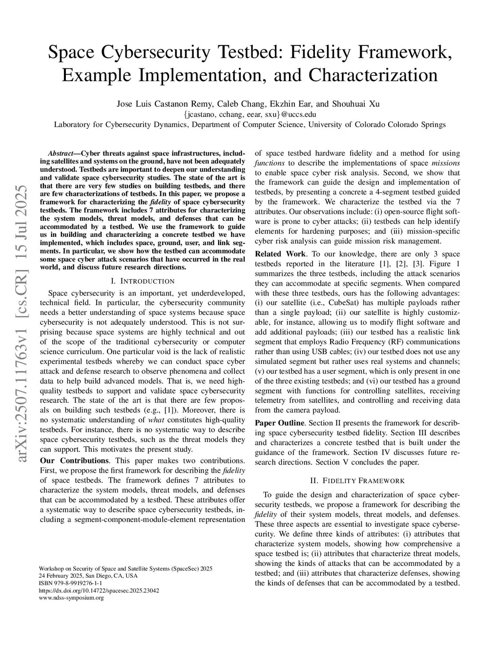 Space Cybersecurity Testbed: Fidelity Framework, Example Implementation, and Characterization