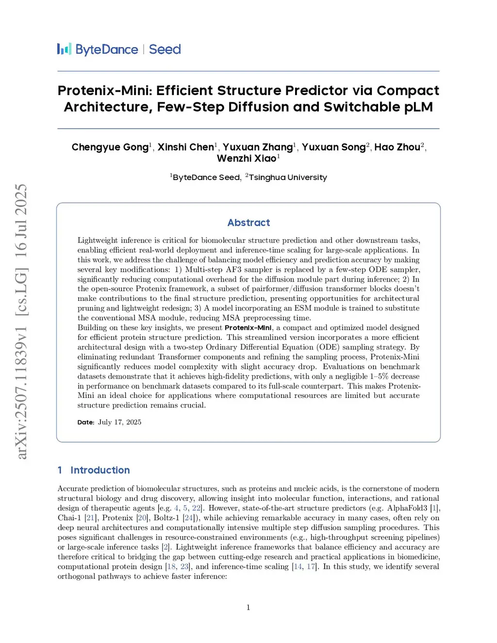 Lightweight inference is critical for biomolecular structure prediction and other downstream tasks, enabling efficient real-world deployment and inference-time scaling for large-scale applications. In this work, we address the challenge of balancing model efficiency and prediction accuracy by making several key modifications, 1) Multi-step AF3 sampler is replaced by a few-step ODE sampler, significantly reducing computational overhead for the diffusion module part during inference; 2) In the open-source Protenix framework, a subset of pairformer or diffusion transformer blocks doesn't make contributions to the final structure prediction, presenting opportunities for architectural pruning and lightweight redesign; 3) A model incorporating an ESM module is trained to substitute the conventional MSA module, reducing MSA preprocessing time. Building on these key insights, we present Protenix-Mini, a compact and optimized model designed for efficient protein structure prediction. This streamlined version incorporates a more efficient architectural design with a two-step Ordinary Differential Equation (ODE) sampling strategy. By eliminating redundant Transformer components and refining the sampling process, Protenix-Mini significantly reduces model complexity with slight accuracy drop. Evaluations on benchmark datasets demonstrate that it achieves high-fidelity predictions, with only a negligible 1 to 5 percent decrease in performance on benchmark datasets compared to its full-scale counterpart. This makes Protenix-Mini an ideal choice for applications where computational resources are limited but accurate structure prediction remains crucial.