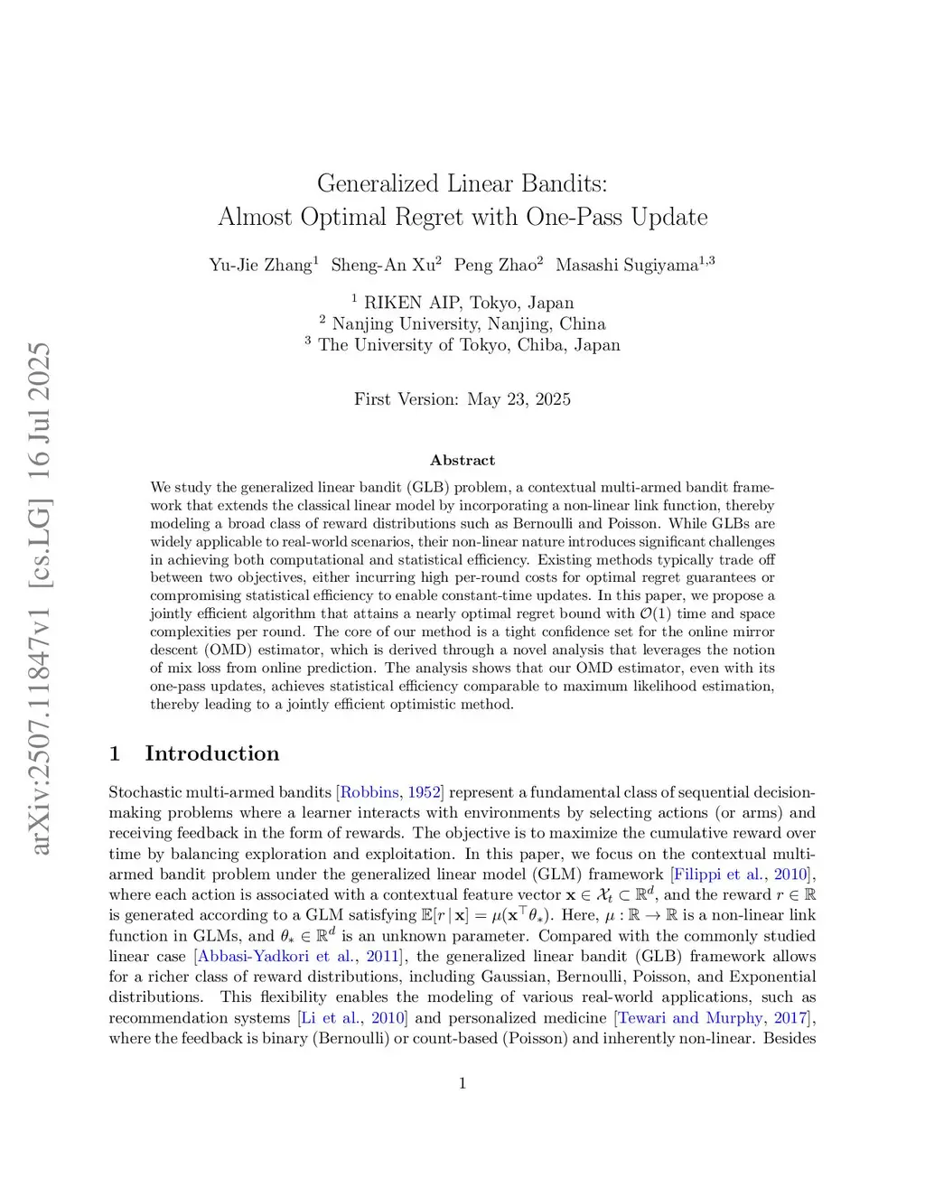 Generalized Linear Bandits: Almost Optimal Regret with One-Pass Update