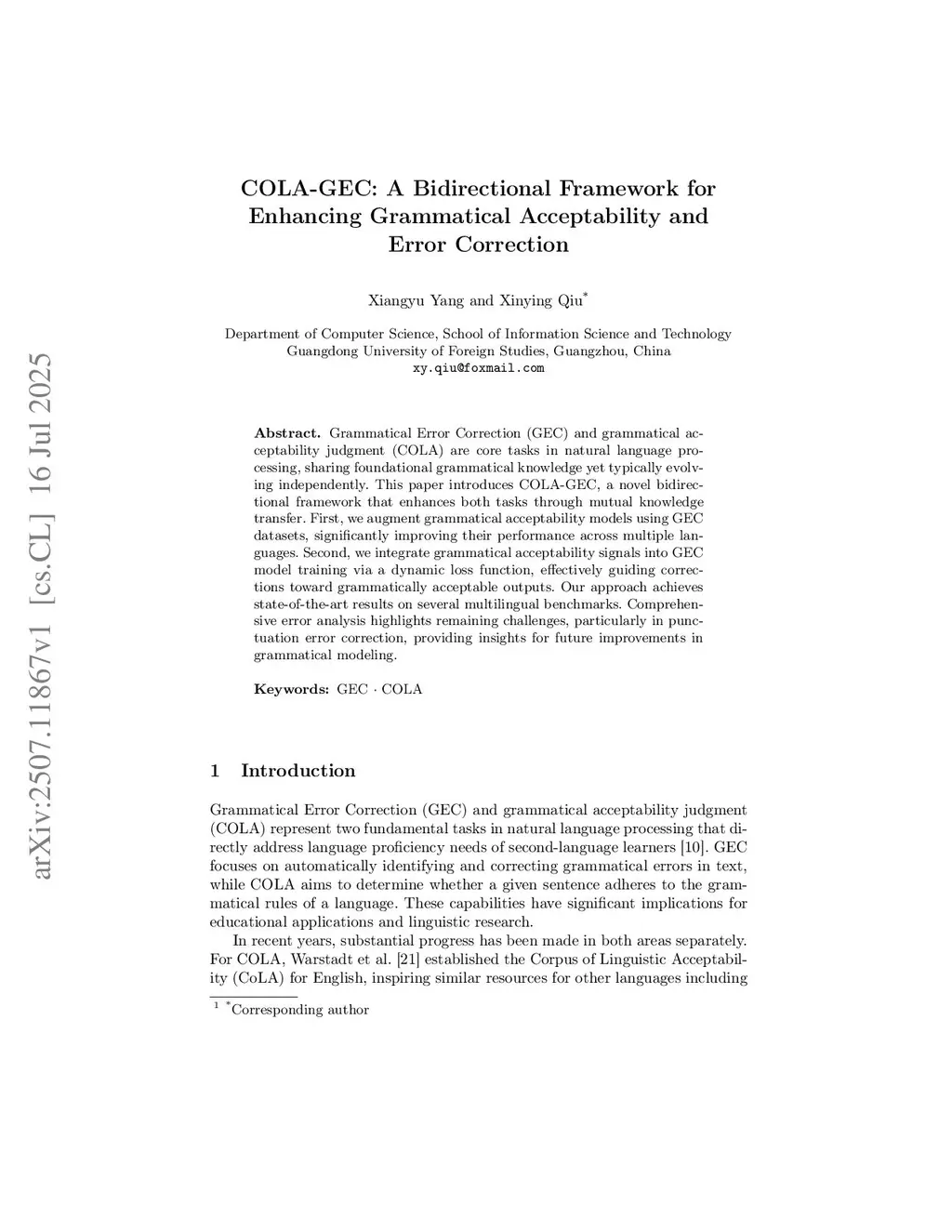 COLA-GEC: A Bidirectional Framework for Enhancing Grammatical Acceptability and Error Correction