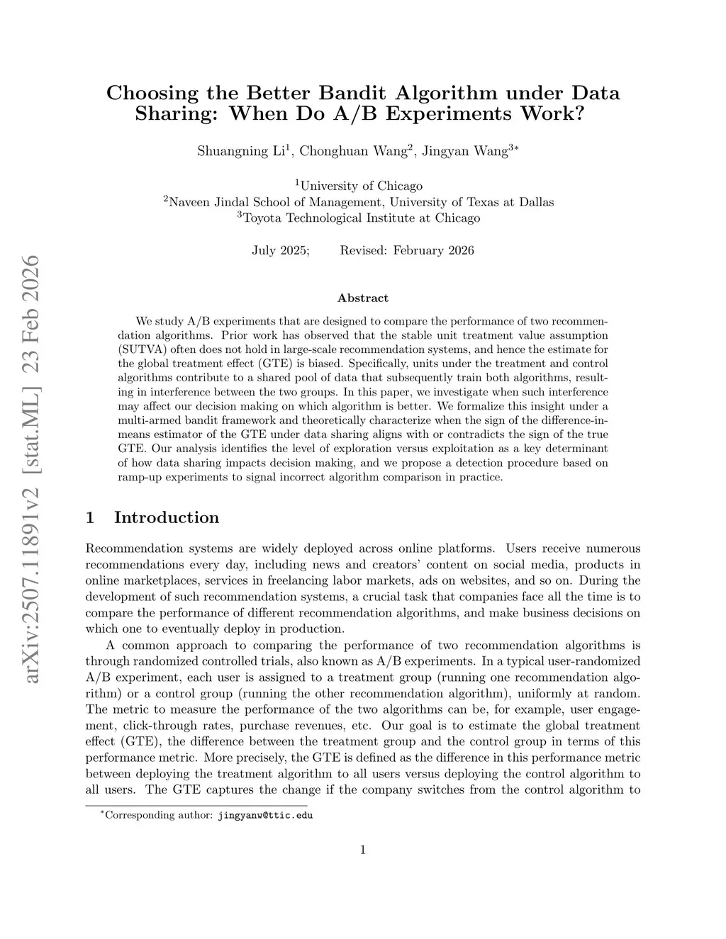 We study A/B experiments that are designed to compare the performance of two recommendation algorithms. Prior work has observed that the stable unit treatment value assumption (SUTVA) often does not hold in large-scale recommendation systems, and hence the estimate for the global treatment effect (GTE) is biased. Specifically, units under the treatment and control algorithms contribute to a shared pool of data that subsequently train both algorithms, resulting in interference between the two groups. In this paper, we investigate when such interference may affect our decision making on which algorithm is better. We formalize this insight under a multi-armed bandit framework and theoretically characterize when the sign of the difference-in-means estimator of the GTE under data sharing aligns with or contradicts the sign of the true GTE. Our analysis identifies the level of exploration versus exploitation as a key determinant of how data sharing impacts decision making, and we propose a detection procedure based on ramp-up experiments to signal incorrect algorithm comparison in practice.