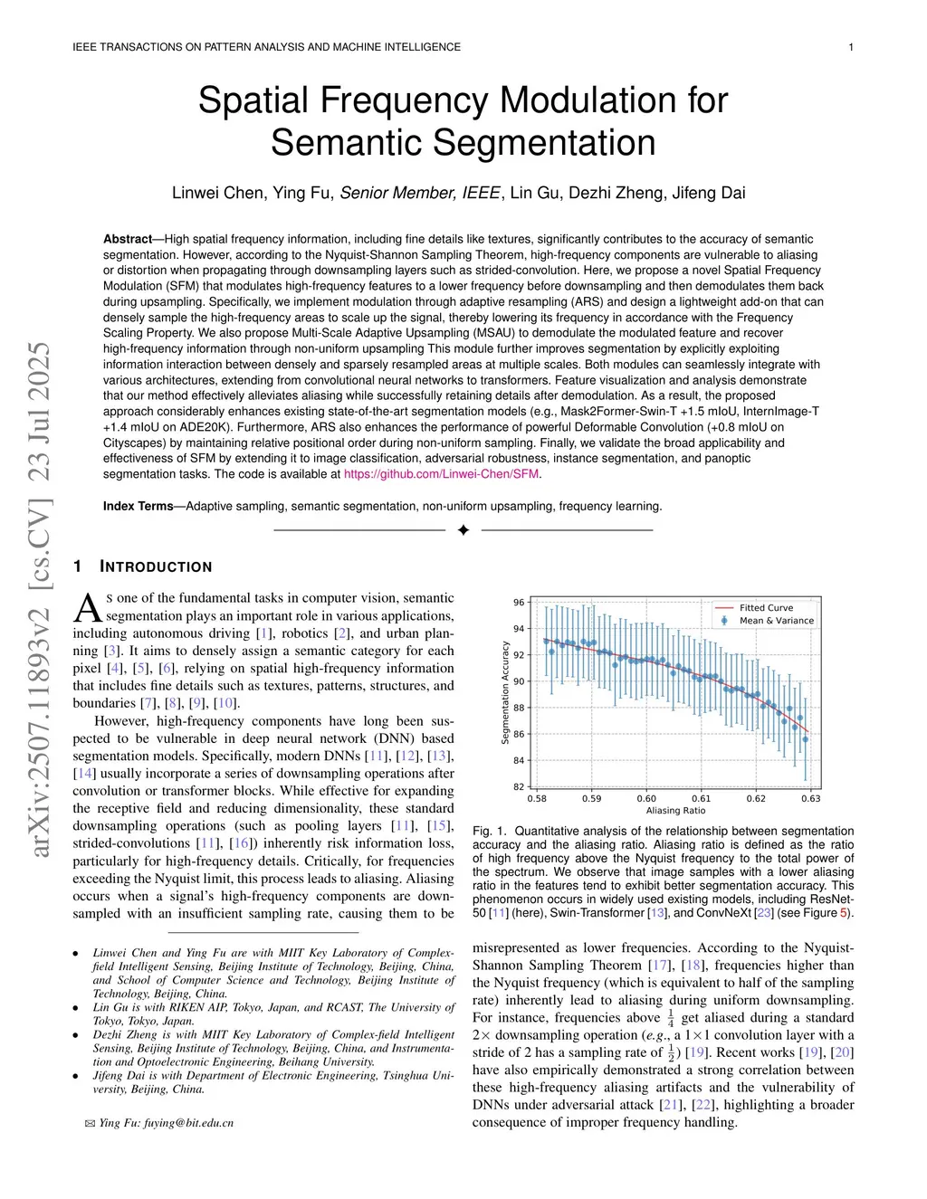 High spatial frequency information, including fine details like textures, significantly contributes to the accuracy of semantic segmentation. However, according to the Nyquist-Shannon Sampling Theorem, high-frequency components are vulnerable to aliasing or distortion when propagating through downsampling layers such as strided-convolution. Here, we propose a novel Spatial Frequency Modulation (SFM) that modulates high-frequency features to a lower frequency before downsampling and then demodulates them back during upsampling. Specifically, we implement modulation through adaptive resampling (ARS) and design a lightweight add-on that can densely sample the high-frequency areas to scale up the signal, thereby lowering its frequency in accordance with the Frequency Scaling Property. We also propose Multi-Scale Adaptive Upsampling (MSAU) to demodulate the modulated feature and recover high-frequency information through non-uniform upsampling This module further improves segmentation by explicitly exploiting information interaction between densely and sparsely resampled areas at multiple scales. Both modules can seamlessly integrate with various architectures, extending from convolutional neural networks to transformers. Feature visualization and analysis confirm that our method effectively alleviates aliasing while successfully retaining details after demodulation. Finally, we validate the broad applicability and effectiveness of SFM by extending it to image classification, adversarial robustness, instance segmentation, and panoptic segmentation tasks. The code is available atthis https URL.