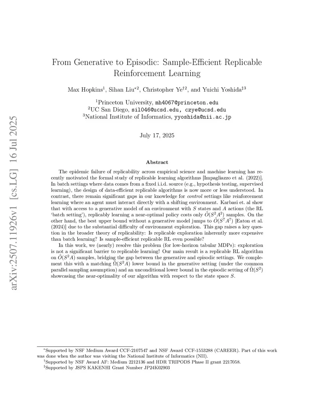 The epidemic failure of replicability across empirical science and machine learning has recently motivated the formal study of replicable learning algorithms [Impagliazzo et al. (2022)]. In batch settings where data comes from a fixed i.i.d. source (e.g., hypothesis testing, supervised learning), the design of data-efficient replicable algorithms is now more or less understood. In contrast, there remain significant gaps in our knowledge for control settings like reinforcement learning where an agent must interact directly with a shifting environment. Karbasi et. al show that with access to a generative model of an environment with states and actions (the RL 'batch setting'), replicably learning a near-optimal policy costs only samples. On the other hand, the best upper bound without a generative model jumps to [Eaton et al. (2024)] due to the substantial difficulty of environment exploration. This gap raises a key question in the broader theory of replicability: Is replicable exploration inherently more expensive than batch learning? Is sample-efficient replicable RL even possible?In this work, we (nearly) resolve this problem (for low-horizon tabular MDPs): exploration is not a significant barrier to replicable learning! Our main result is a replicable RL algorithm on samples, bridging the gap between the generative and episodic settings. We complement this with a matching lower bound in the generative setting (under the common parallel sampling assumption) and an unconditional lower bound in the episodic setting of showcasing the near-optimality of our algorithm with respect to the state space .