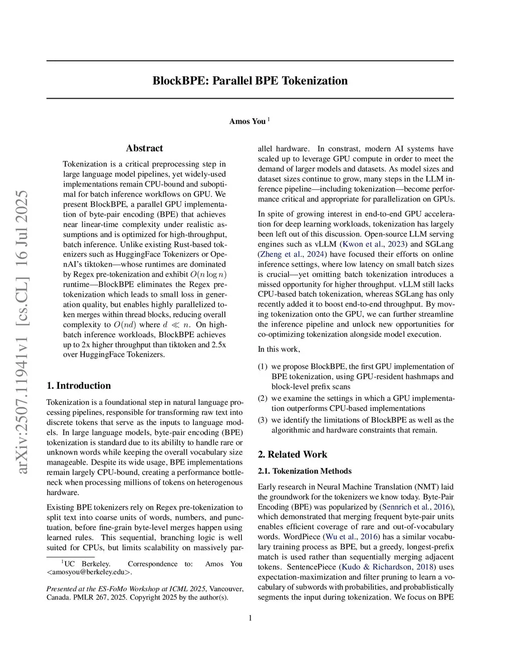 BlockBPE: Parallel BPE Tokenization