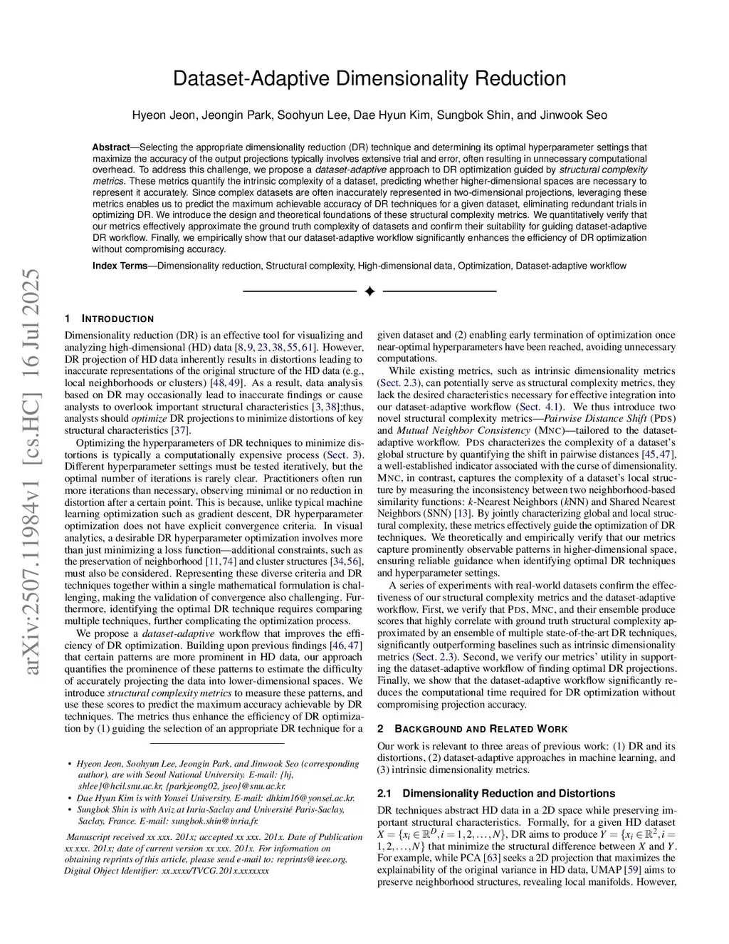 Selecting the appropriate dimensionality reduction (DR) technique and determining its optimal hyperparameter settings that maximize the accuracy of the output projections typically involves extensive trial and error, often resulting in unnecessary computational overhead. To address this challenge, we propose a dataset-adaptive approach to DR optimization guided by structural complexity metrics. These metrics quantify the intrinsic complexity of a dataset, predicting whether higher-dimensional spaces are necessary to represent it accurately. Since complex datasets are often inaccurately represented in two-dimensional projections, leveraging these metrics enables us to predict the maximum achievable accuracy of DR techniques for a given dataset, eliminating redundant trials in optimizing DR. We introduce the design and theoretical foundations of these structural complexity metrics. We quantitatively verify that our metrics effectively approximate the ground truth complexity of datasets and confirm their suitability for guiding dataset-adaptive DR workflow. Finally, we empirically show that our dataset-adaptive workflow significantly enhances the efficiency of DR optimization without compromising accuracy.