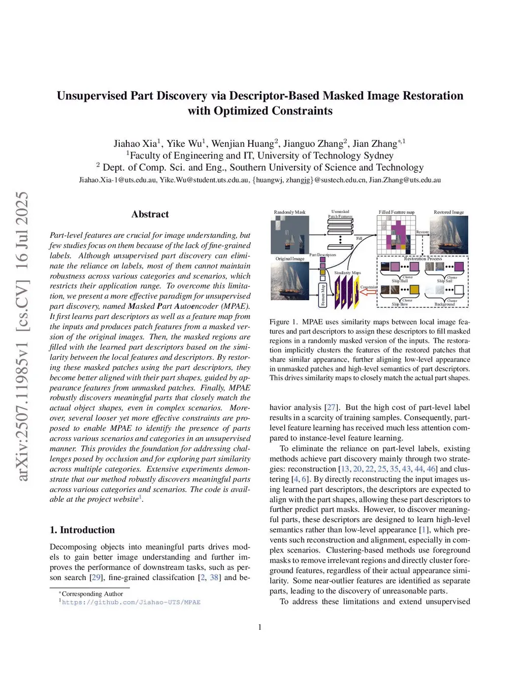 Unsupervised Part Discovery via Descriptor-Based Masked Image Restoration with Optimized Constraints