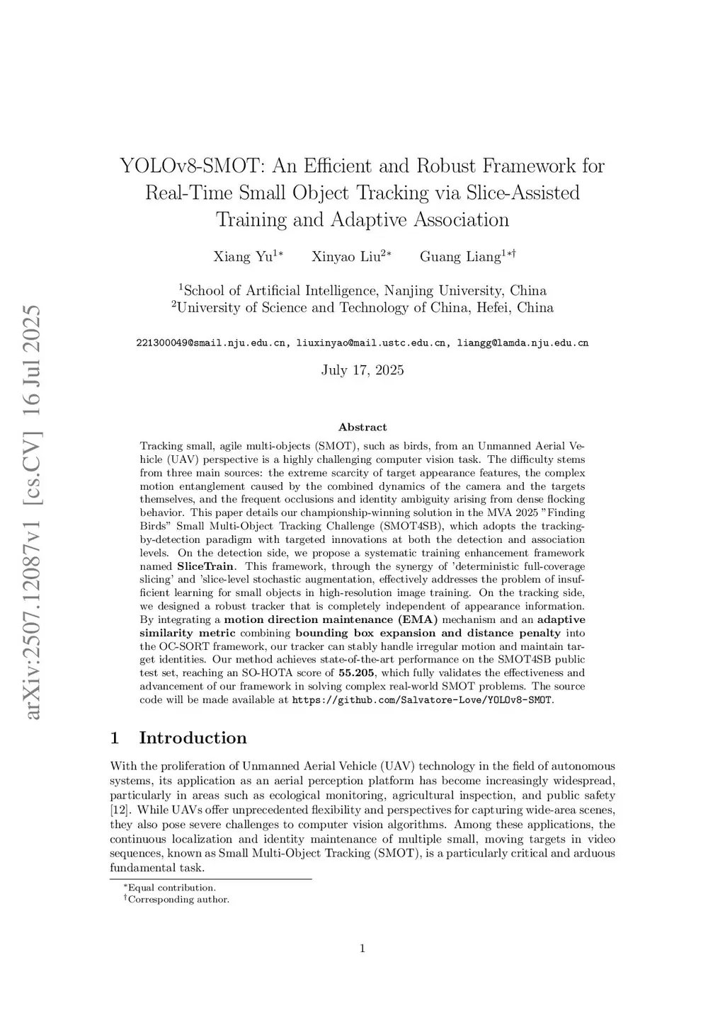 Tracking small, agile multi-objects (SMOT), such as birds, from an Unmanned Aerial Vehicle (UAV) perspective is a highly challenging computer vision task. The difficulty stems from three main sources: the extreme scarcity of target appearance features, the complex motion entanglement caused by the combined dynamics of the camera and the targets themselves, and the frequent occlusions and identity ambiguity arising from dense flocking behavior. This paper details our championship-winning solution in the MVA 2025 "Finding Birds" Small Multi-Object Tracking Challenge (SMOT4SB), which adopts the tracking-by-detection paradigm with targeted innovations at both the detection and association levels. On the detection side, we propose a systematic training enhancement framework named \textbf{SliceTrain}. This framework, through the synergy of 'deterministic full-coverage slicing' and 'slice-level stochastic augmentation, effectively addresses the problem of insufficient learning for small objects in high-resolution image training. On the tracking side, we designed a robust tracker that is completely independent of appearance information. By integrating a \textbf{motion direction maintenance (EMA)} mechanism and an \textbf{adaptive similarity metric} combining \textbf{bounding box expansion and distance penalty} into the OC-SORT framework, our tracker can stably handle irregular motion and maintain target identities. Our method achieves state-of-the-art performance on the SMOT4SB public test set, reaching an SO-HOTA score of \textbf{55.205}, which fully validates the effectiveness and advancement of our framework in solving complex real-world SMOT problems. The source code will be made available atthis https URL.