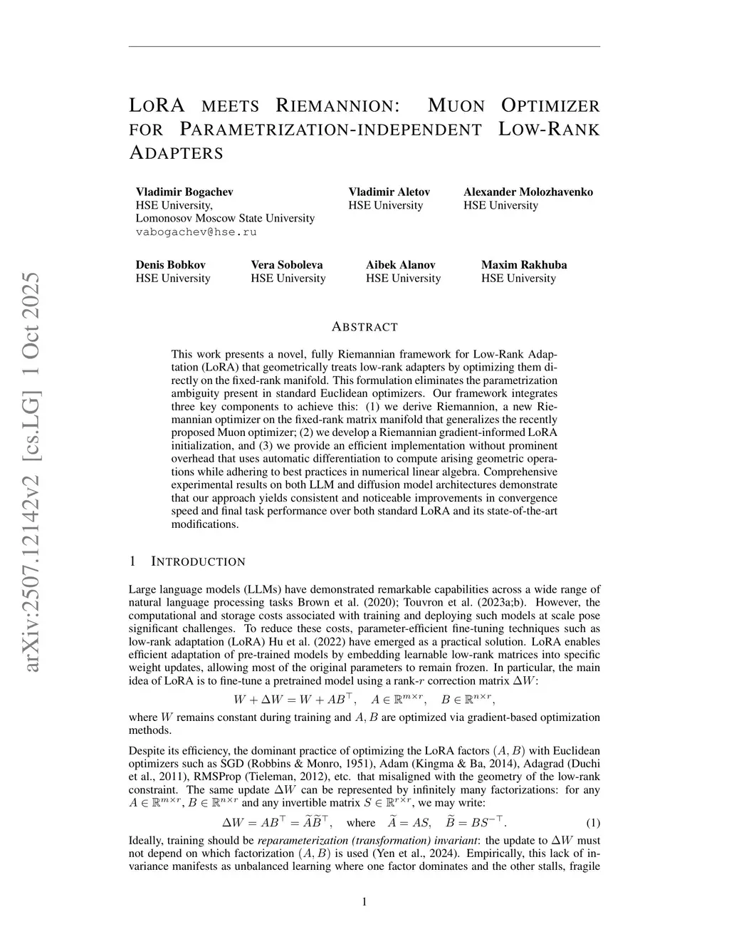 This work presents a novel, fully Riemannian framework for Low-Rank Adaptation (LoRA) that geometrically treats low-rank adapters by optimizing them directly on the fixed-rank manifold. This formulation eliminates the parametrization ambiguity present in standard Euclidean optimizers. Our framework integrates three key components to achieve this: (1) we derive Riemannion, a new Riemannian optimizer on the fixed-rank matrix manifold that generalizes the recently proposed Muon optimizer; (2) we develop a Riemannian gradient-informed LoRA initialization, and (3) we provide an efficient implementation without prominent overhead that uses automatic differentiation to compute arising geometric operations while adhering to best practices in numerical linear algebra. Comprehensive experimental results on both LLM and diffusion model architectures demonstrate that our approach yields consistent and noticeable improvements in convergence speed and final task performance over both standard LoRA and its state-of-the-art modifications.