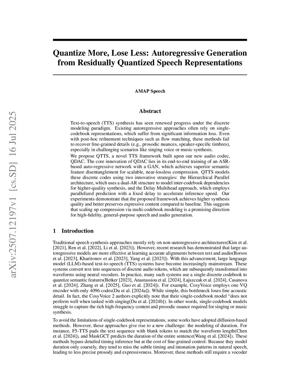 Text-to-speech (TTS) synthesis has seen renewed progress under the discrete modeling paradigm. Existing autoregressive approaches often rely on single-codebook representations, which suffer from significant information loss. Even with post-hoc refinement techniques such as flow matching, these methods fail to recover fine-grained details (e.g., prosodic nuances, speaker-specific timbres), especially in challenging scenarios like singing voice or music synthesis. We propose QTTS, a novel TTS framework built upon our new audio codec, QDAC. The core innovation of QDAC lies in its end-to-end training of an ASR-based auto-regressive network with a GAN, which achieves superior semantic feature disentanglement for scalable, near-lossless compression. QTTS models these discrete codes using two innovative strategies: the Hierarchical Parallel architecture, which uses a dual-AR structure to model inter-codebook dependencies for higher-quality synthesis, and the Delay Multihead approach, which employs parallelized prediction with a fixed delay to accelerate inference speed. Our experiments demonstrate that the proposed framework achieves higher synthesis quality and better preserves expressive content compared to baseline. This suggests that scaling up compression via multi-codebook modeling is a promising direction for high-fidelity, general-purpose speech and audio generation.