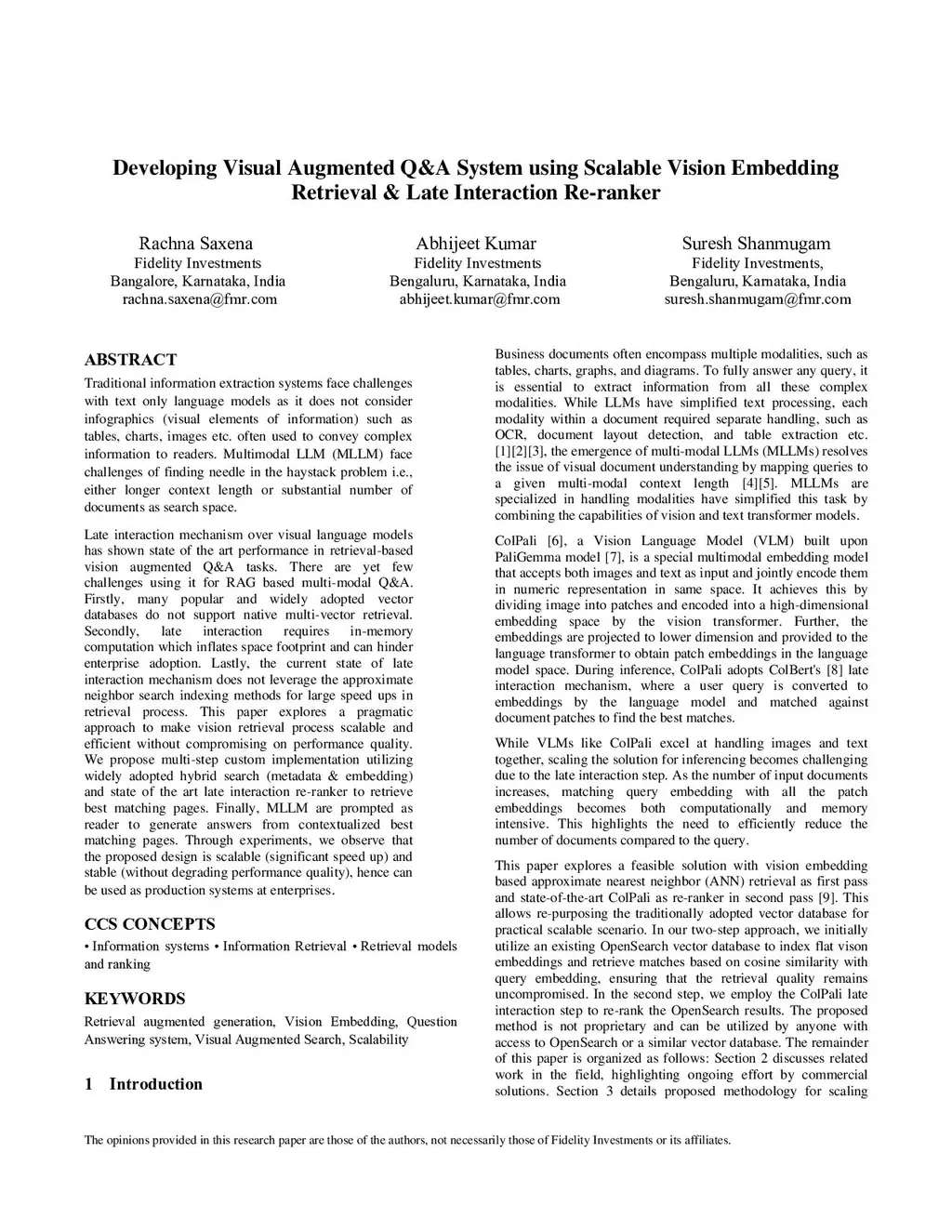 Developing Visual Augmented Q&A System using Scalable Vision Embedding Retrieval & Late Interaction Re-ranker