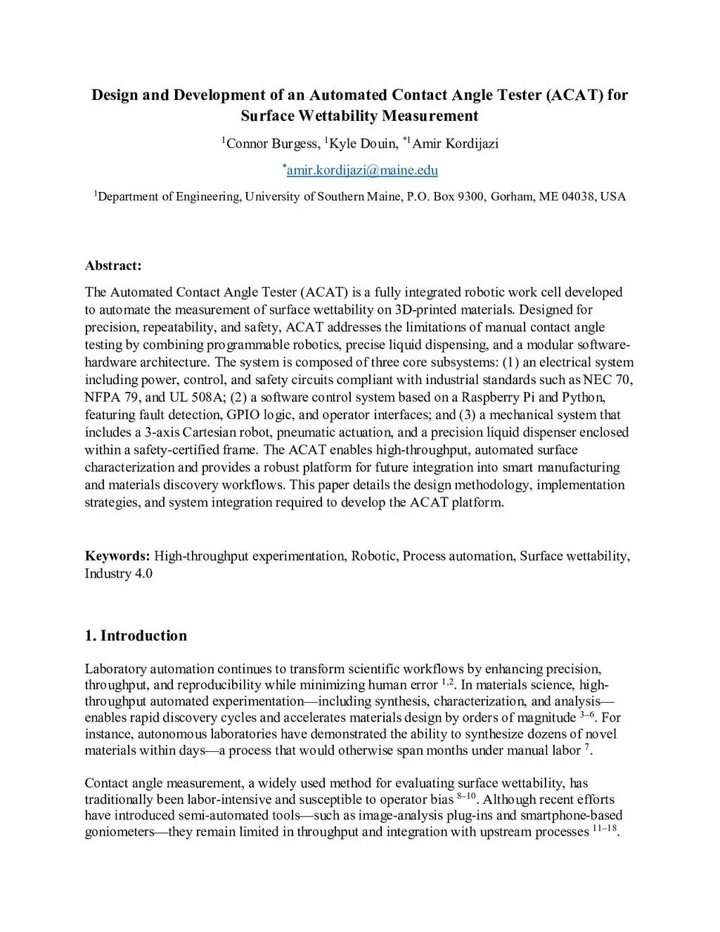 The Automated Contact Angle Tester (ACAT) is a fully integrated robotic work cell developed to automate the measurement of surface wettability on 3D-printed materials. Designed for precision, repeatability, and safety, ACAT addresses the limitations of manual contact angle testing by combining programmable robotics, precise liquid dispensing, and a modular software-hardware architecture. The system is composed of three core subsystems: (1) an electrical system including power, control, and safety circuits compliant with industrial standards such as NEC 70, NFPA 79, and UL 508A; (2) a software control system based on a Raspberry Pi and Python, featuring fault detection, GPIO logic, and operator interfaces; and (3) a mechanical system that includes a 3-axis Cartesian robot, pneumatic actuation, and a precision liquid dispenser enclosed within a safety-certified frame. The ACAT enables high-throughput, automated surface characterization and provides a robust platform for future integration into smart manufacturing and materials discovery workflows. This paper details the design methodology, implementation strategies, and system integration required to develop the ACAT platform.