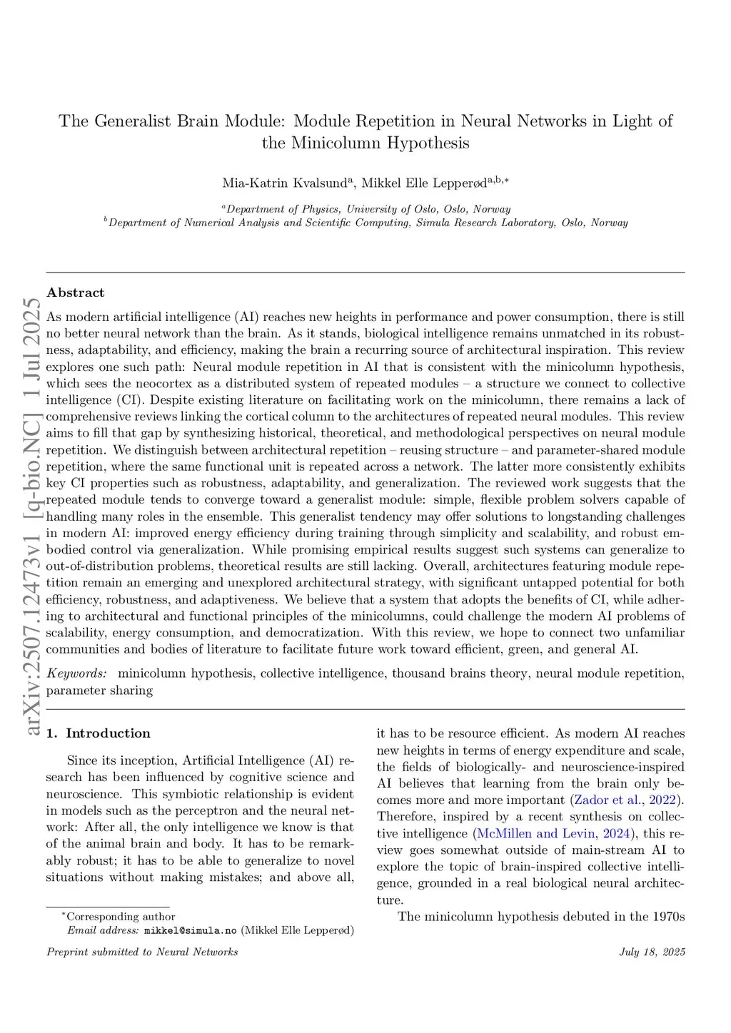 While modern AI continues to advance, the biological brain remains the pinnacle of neural networks in its robustness, adaptability, and efficiency. This review explores an AI architectural path inspired by the brain's structure, particularly the minicolumn hypothesis, which views the neocortex as a distributed system of repeated modules - a structure we connect to collective intelligence (CI). Despite existing work, there is a lack of comprehensive reviews connecting the cortical column to the architectures of repeated neural modules. This review aims to fill that gap by synthesizing historical, theoretical, and methodological perspectives on neural module repetition. We distinguish between architectural repetition - reusing structure - and parameter-shared module repetition, where the same functional unit is repeated across a network. The latter exhibits key CI properties such as robustness, adaptability, and generalization. Evidence suggests that the repeated module tends to converge toward a generalist module: simple, flexible problem solvers capable of handling many roles in the ensemble. This generalist tendency may offer solutions to longstanding challenges in modern AI: improved energy efficiency during training through simplicity and scalability, and robust embodied control via generalization. While empirical results suggest such systems can generalize to out-of-distribution problems, theoretical results are still lacking. Overall, architectures featuring module repetition remain an emerging and unexplored architectural strategy, with significant untapped potential for both efficiency, robustness, and adaptiveness. We believe that a system that adopts the benefits of CI, while adhering to architectural and functional principles of the minicolumns, could challenge the modern AI problems of scalability, energy consumption, and democratization.