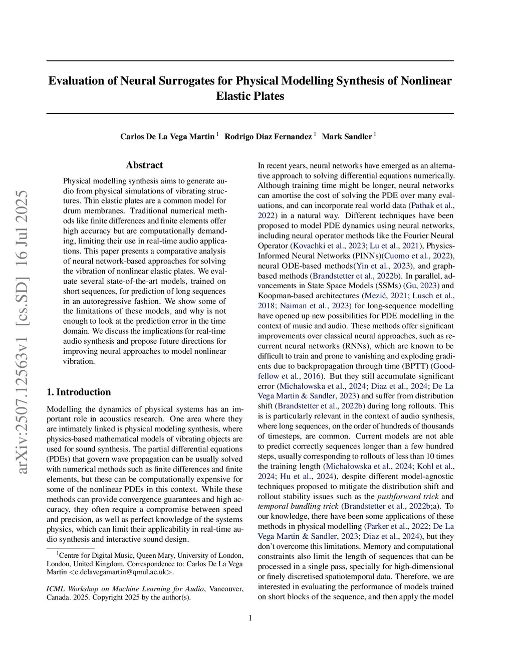Physical modelling synthesis aims to generate audio from physical simulations of vibrating structures. Thin elastic plates are a common model for drum membranes. Traditional numerical methods like finite differences and finite elements offer high accuracy but are computationally demanding, limiting their use in real-time audio applications. This paper presents a comparative analysis of neural network-based approaches for solving the vibration of nonlinear elastic plates. We evaluate several state-of-the-art models, trained on short sequences, for prediction of long sequences in an autoregressive fashion. We show some of the limitations of these models, and why is not enough to look at the prediction error in the time domain. We discuss the implications for real-time audio synthesis and propose future directions for improving neural approaches to model nonlinear vibration.