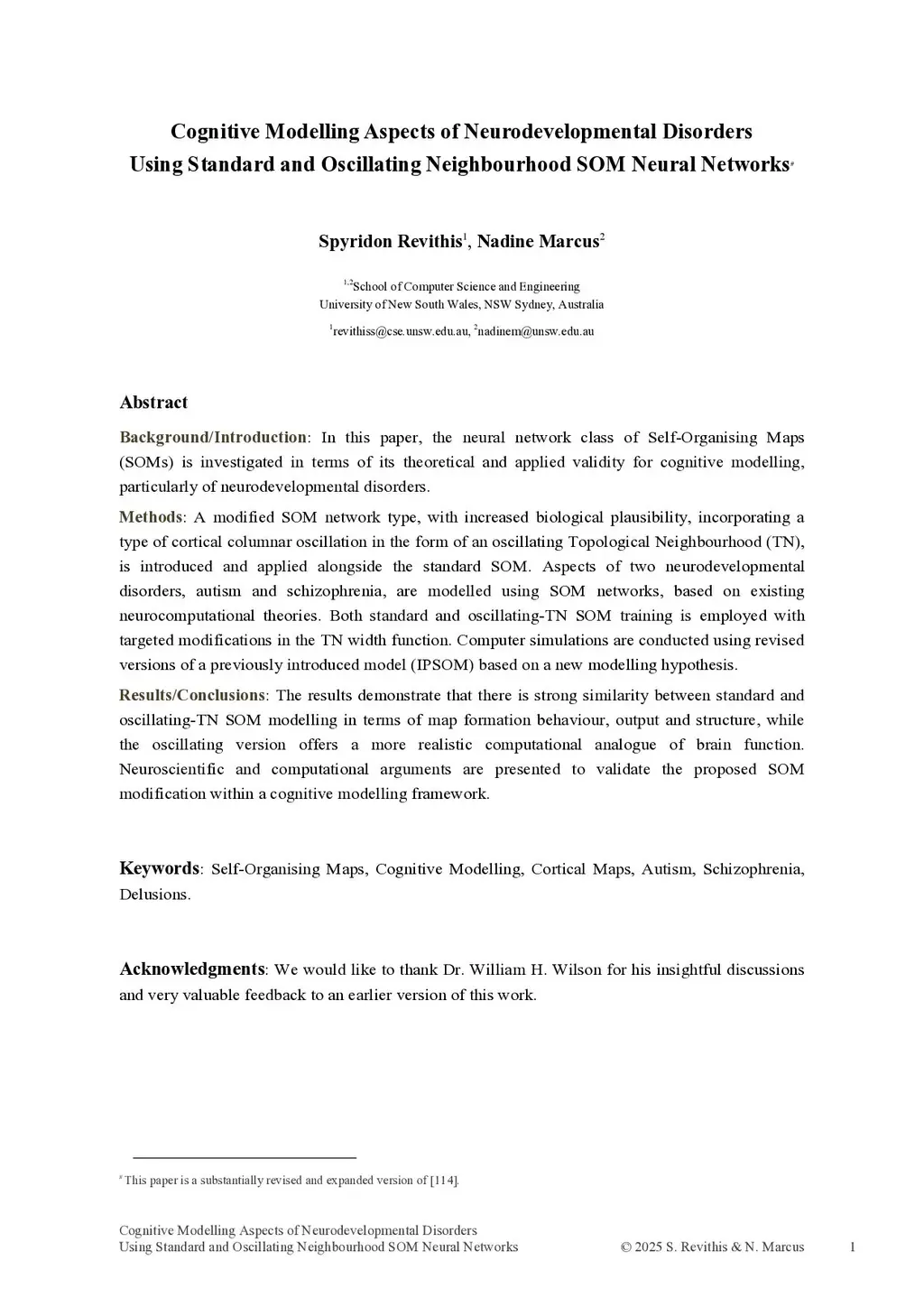 Background/Introduction: In this paper, the neural network class of Self-Organising Maps (SOMs) is investigated in terms of its theoretical and applied validity for cognitive modelling, particularly of neurodevelopmental disorders.Methods: A modified SOM network type, with increased biological plausibility, incorporating a type of cortical columnar oscillation in the form of an oscillating Topological Neighbourhood (TN), is introduced and applied alongside the standard SOM. Aspects of two neurodevelopmental disorders, autism and schizophrenia, are modelled using SOM networks, based on existing neurocomputational theories. Both standard and oscillating-TN SOM training is employed with targeted modifications in the TN width function. Computer simulations are conducted using revised versions of a previously introduced model (IPSOM) based on a new modelling hypothesis.Results/Conclusions: The results demonstrate that there is strong similarity between standard and oscillating-TN SOM modelling in terms of map formation behaviour, output and structure, while the oscillating version offers a more realistic computational analogue of brain function. Neuroscientific and computational arguments are presented to validate the proposed SOM modification within a cognitive modelling framework.