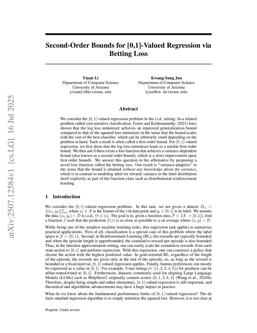 We consider the -valued regression problem in the i.i.d. setting. In a related problem called cost-sensitive classification, \citet{foster21efficient} have shown that the log loss minimizer achieves an improved generalization bound compared to that of the squared loss minimizer in the sense that the bound scales with the cost of the best classifier, which can be arbitrarily small depending on the problem at hand. Such a result is often called a first-order bound. For -valued regression, we first show that the log loss minimizer leads to a similar first-order bound. We then ask if there exists a loss function that achieves a variance-dependent bound (also known as a second order bound), which is a strict improvement upon first-order bounds. We answer this question in the affirmative by proposing a novel loss function called the betting loss. Our result is ``variance-adaptive'' in the sense that the bound is attained \textit{without any knowledge about the variance}, which is in contrast to modeling label (or reward) variance or the label distribution itself explicitly as part of the function class such as distributional reinforcement learning.