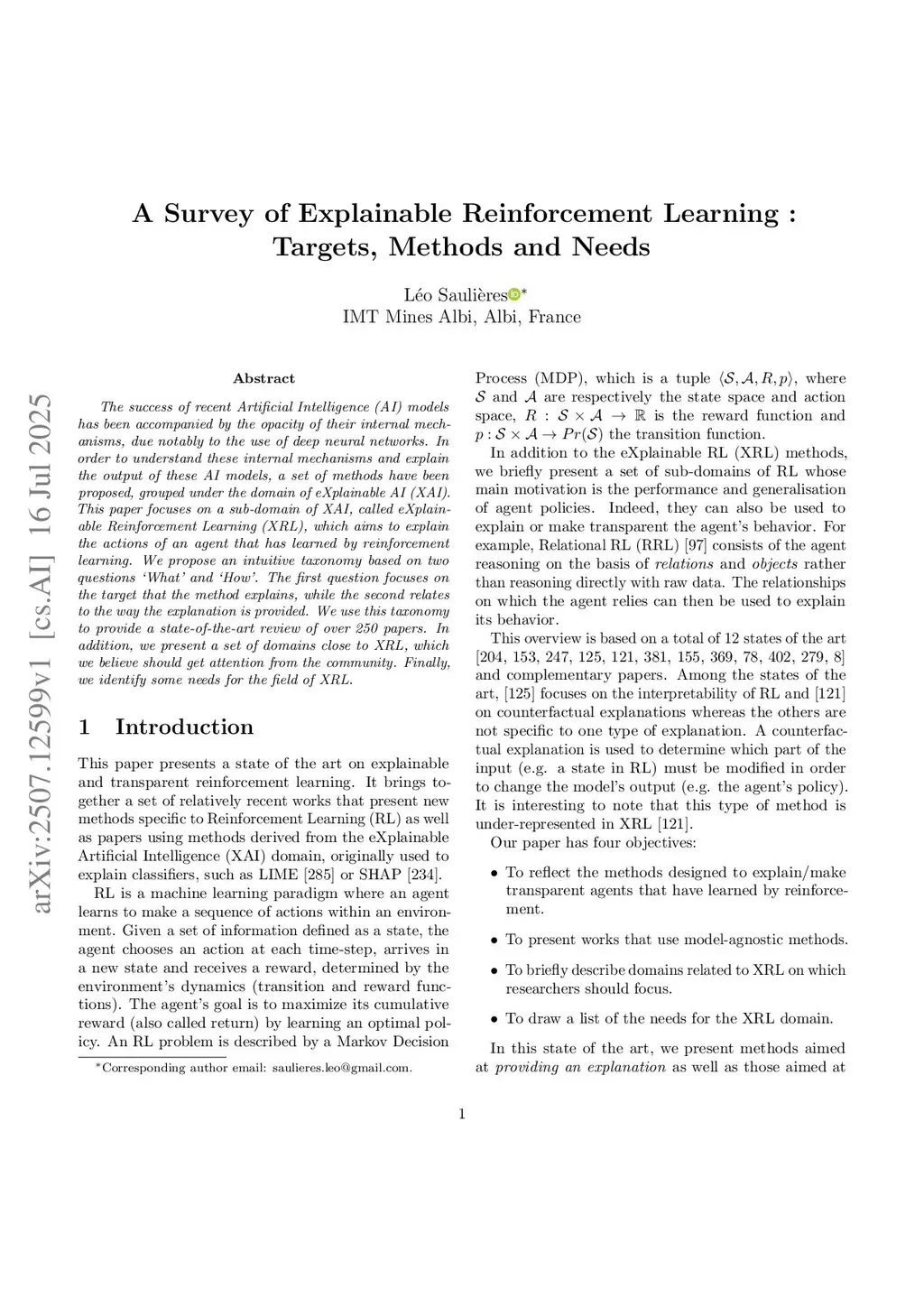 A Survey of Explainable Reinforcement Learning: Targets, Methods and Needs