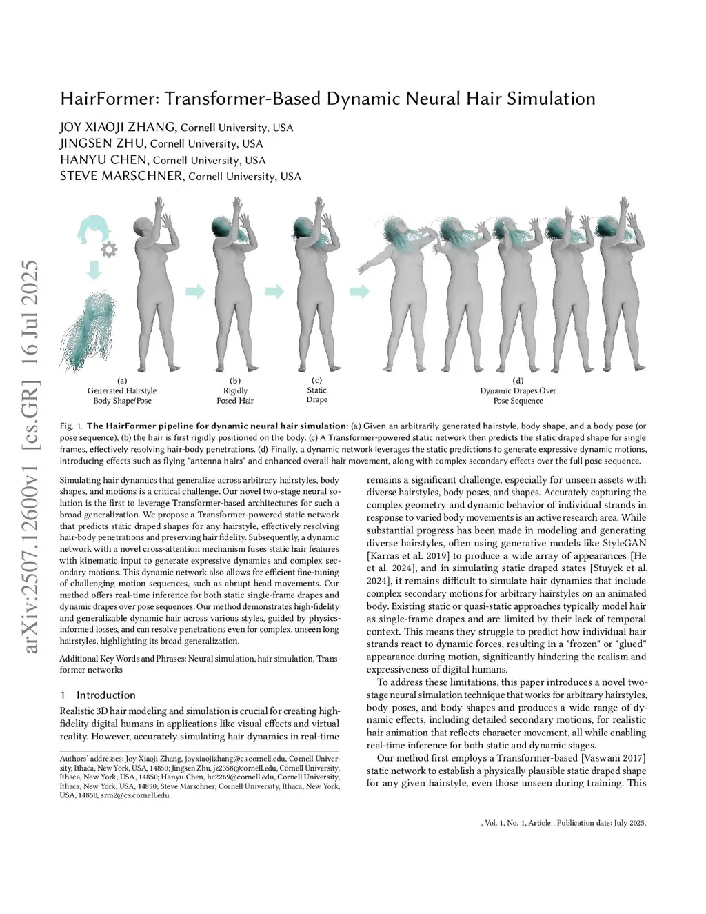 Simulating hair dynamics that generalize across arbitrary hairstyles, body shapes, and motions is a critical challenge. Our novel two-stage neural solution is the first to leverage Transformer-based architectures for such a broad generalization. We propose a Transformer-powered static network that predicts static draped shapes for any hairstyle, effectively resolving hair-body penetrations and preserving hair fidelity. Subsequently, a dynamic network with a novel cross-attention mechanism fuses static hair features with kinematic input to generate expressive dynamics and complex secondary motions. This dynamic network also allows for efficient fine-tuning of challenging motion sequences, such as abrupt head movements. Our method offers real-time inference for both static single-frame drapes and dynamic drapes over pose sequences. Our method demonstrates high-fidelity and generalizable dynamic hair across various styles, guided by physics-informed losses, and can resolve penetrations even for complex, unseen long hairstyles, highlighting its broad generalization.