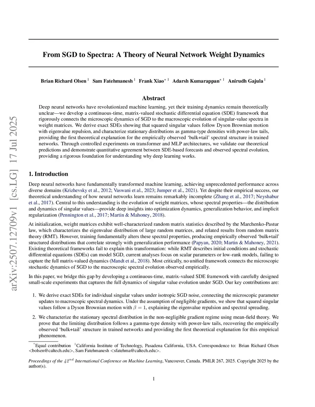 Deep neural networks have revolutionized machine learning, yet their training dynamics remain theoretically unclear-we develop a continuous-time, matrix-valued stochastic differential equation (SDE) framework that rigorously connects the microscopic dynamics of SGD to the macroscopic evolution of singular-value spectra in weight matrices. We derive exact SDEs showing that squared singular values follow Dyson Brownian motion with eigenvalue repulsion, and characterize stationary distributions as gamma-type densities with power-law tails, providing the first theoretical explanation for the empirically observed 'bulk+tail' spectral structure in trained networks. Through controlled experiments on transformer and MLP architectures, we validate our theoretical predictions and demonstrate quantitative agreement between SDE-based forecasts and observed spectral evolution, providing a rigorous foundation for understanding why deep learning works.