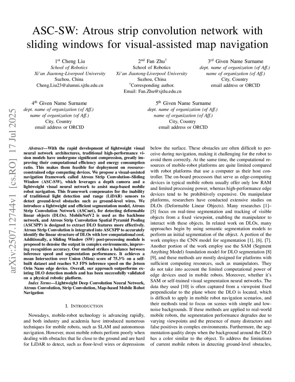 With the rapid development of lightweight visual neural network architectures, traditional high-performance vision models have undergone significant compression, enhancing their computational and energy efficiency and enabling deployment on resource-constrained edge devices. In order to enable the mobile robot to avoid the ground wires, we propose a visual-assisted navigation framework called Atrous Strip Convolution Sliding Window (ASC-SW). This framework compensates for the limitations of traditional light detection and range (LiDAR) sensors to detect ground-level obstacles such as wires. A lightweight and efficient segmentation model, Atrous Strip Convolution Network (ASCnet) was proposed, for detecting deformable linear objects (DLOs). Atrous Strip Convolution Spatial Pyramid Pooling (ASCSPP) is designed to extract DLOs features effectively. Atrous Strip Convolution is integrated into ASCSPP to accurately identify the linear structure of DLOs with low computational cost. Additionally, a Sliding Window (SW) post processing module is proposed to denoise the output in complex environments, improving recognition accuracy. ASC-SW achieves 75.3% MIoU at 217 FPS on a self-built real world dataset and real-robot experiment was demonstrated that our proposed framework. It can be successfully verified on the real-robot on the edge device(Jetson platform) at that were originally inoperable.