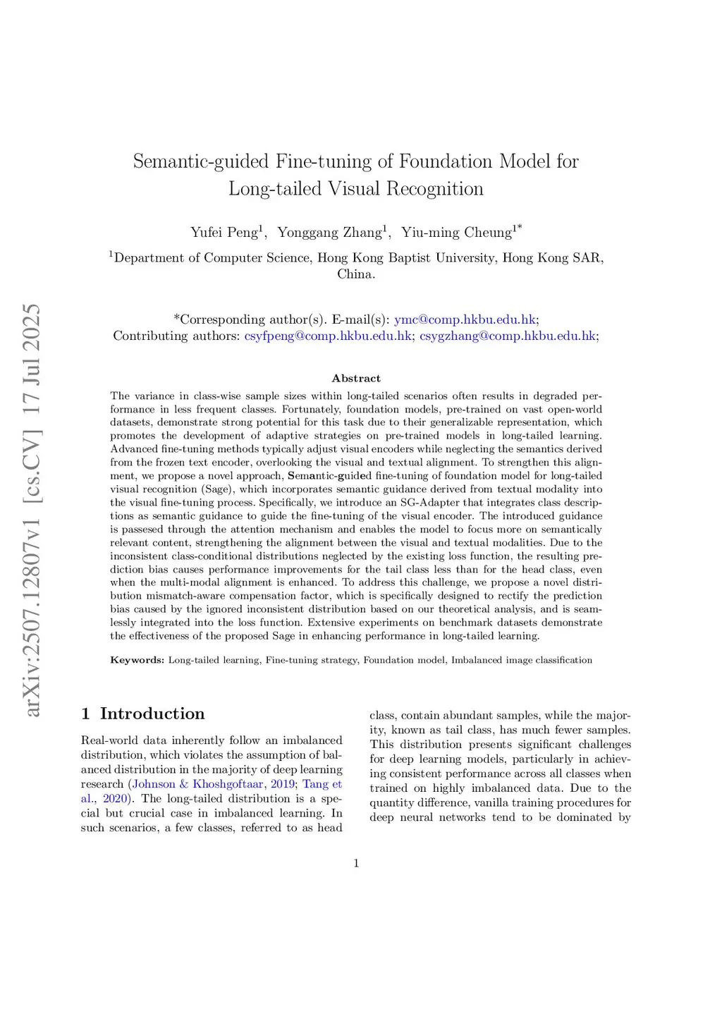 The variance in class-wise sample sizes within long-tailed scenarios often results in degraded performance in less frequent classes. Fortunately, foundation models, pre-trained on vast open-world datasets, demonstrate strong potential for this task due to their generalizable representation, which promotes the development of adaptive strategies on pre-trained models in long-tailed learning. Advanced fine-tuning methods typically adjust visual encoders while neglecting the semantics derived from the frozen text encoder, overlooking the visual and textual alignment. To strengthen this alignment, we propose a novel approach, Semantic-guided fine-tuning of foundation model for long-tailed visual recognition (Sage), which incorporates semantic guidance derived from textual modality into the visual fine-tuning process. Specifically, we introduce an SG-Adapter that integrates class descriptions as semantic guidance to guide the fine-tuning of the visual encoder. The introduced guidance is passesed through the attention mechanism and enables the model to focus more on semantically relevant content, strengthening the alignment between the visual and textual modalities. Due to the inconsistent class-conditional distributions neglected by the existing loss function, the resulting prediction bias causes performance improvements for the tail class less than for the head class, even when the multi-modal alignment is enhanced. To address this challenge, we propose a novel distribution mismatch-aware compensation factor, which is specifically designed to rectify the prediction bias caused by the ignored inconsistent distribution based on our theoretical analysis, and is seamlessly integrated into the loss function. Extensive experiments on benchmark datasets demonstrate the effectiveness of the proposed Sage in enhancing performance in long-tailed learning.
