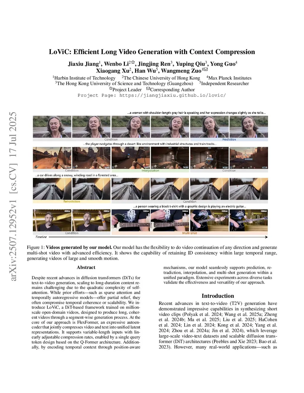 Despite recent advances in diffusion transformers (DiTs) for text-to-video generation, scaling to long-duration content remains challenging due to the quadratic complexity of self-attention. While prior efforts -- such as sparse attention and temporally autoregressive models -- offer partial relief, they often compromise temporal coherence or scalability. We introduce LoViC, a DiT-based framework trained on million-scale open-domain videos, designed to produce long, coherent videos through a segment-wise generation process. At the core of our approach is FlexFormer, an expressive autoencoder that jointly compresses video and text into unified latent representations. It supports variable-length inputs with linearly adjustable compression rates, enabled by a single query token design based on the Q-Former architecture. Additionally, by encoding temporal context through position-aware mechanisms, our model seamlessly supports prediction, retradiction, interpolation, and multi-shot generation within a unified paradigm. Extensive experiments across diverse tasks validate the effectiveness and versatility of our approach.
